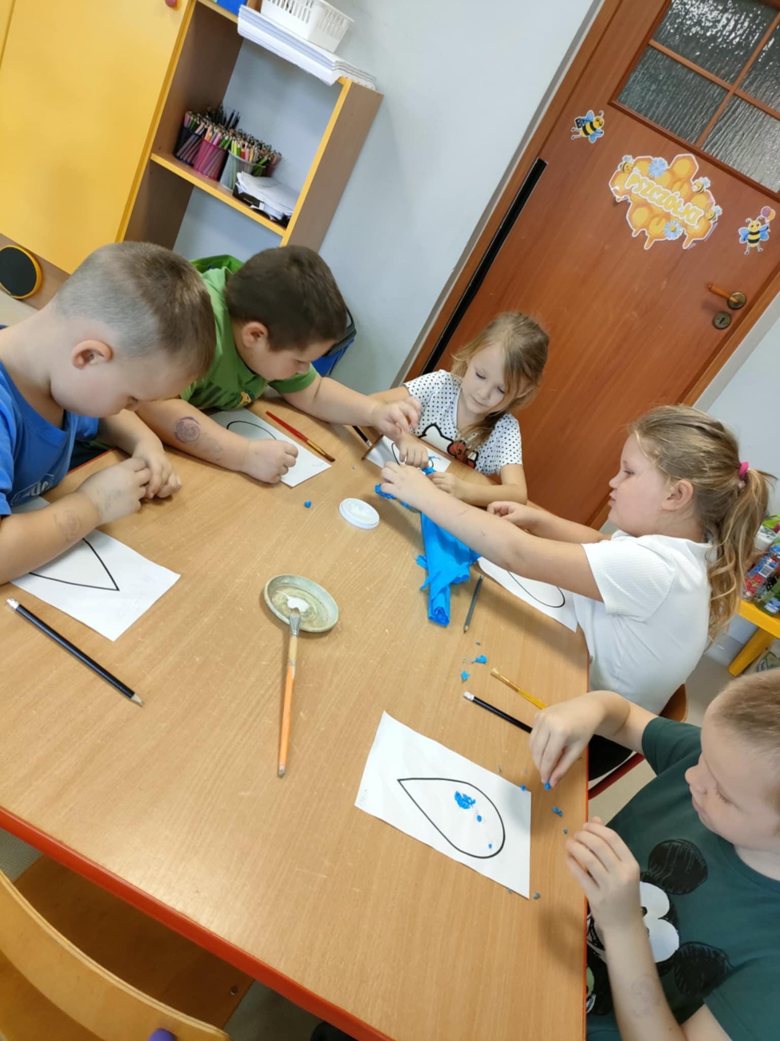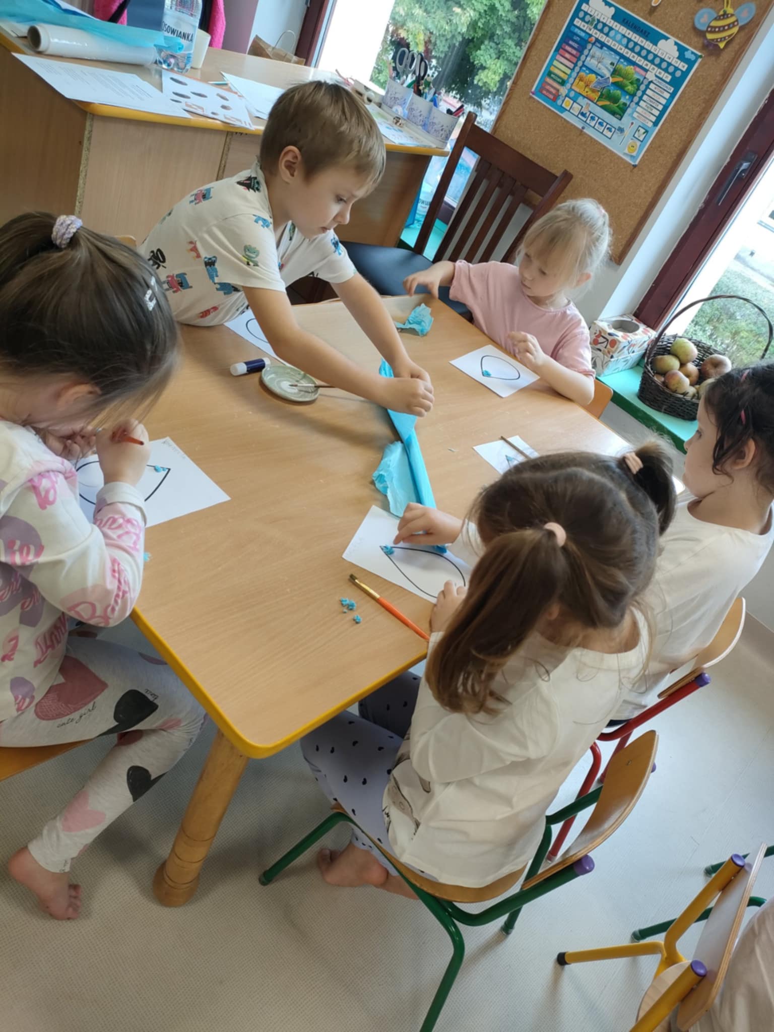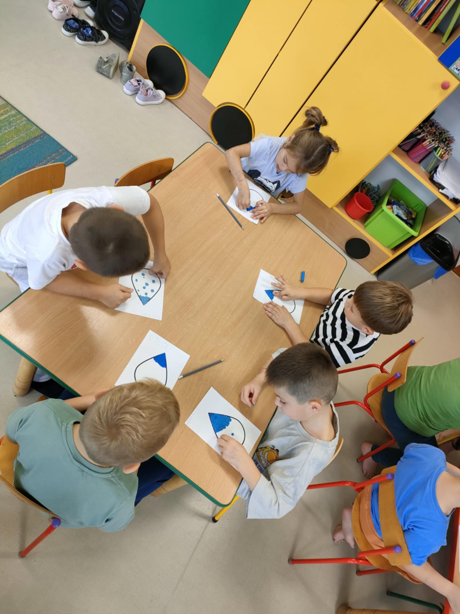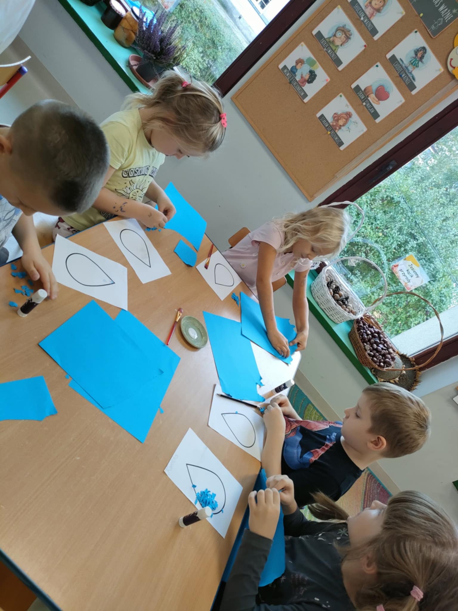 Zdrojek to bohater wspomnianego programu, dzieci go dobrze znają i po wodę często sięgają. Podczas zajęć "Pszczółki" rozwiązywały wodne zagadki słuchowe. Przy udzieleniu poprawnej odpowiedzi, wcielały się w rolę Zdrojka i wymyślały dla rówieśników ciekawe ćwiczenia na dywanie. Po wspólnych zabawach ruchowych, starszaki przystąpiły do pracy stolikowej i zgodnie z losowaniem, wypełniały szablon kropelki daną techniką: wyklejanie kuleczkami z plasteliny bądź bibuły lub wydzieranką z kolorowego papieru. W ten sposób rozwijaliśmy motorykę dużą i małą, a po zajęciach wraz ze Zdrojkiem poczęstowaliśmy się wodą. Takie zajęcia bardzo integrują i angażują przedszkolaki i są świetnym sposobem na naukę w ruchu.