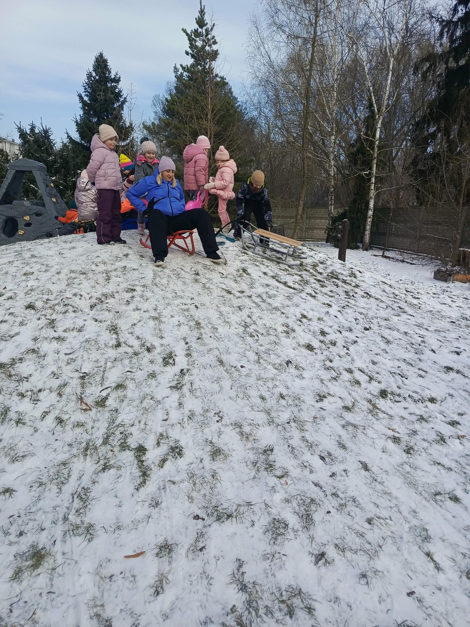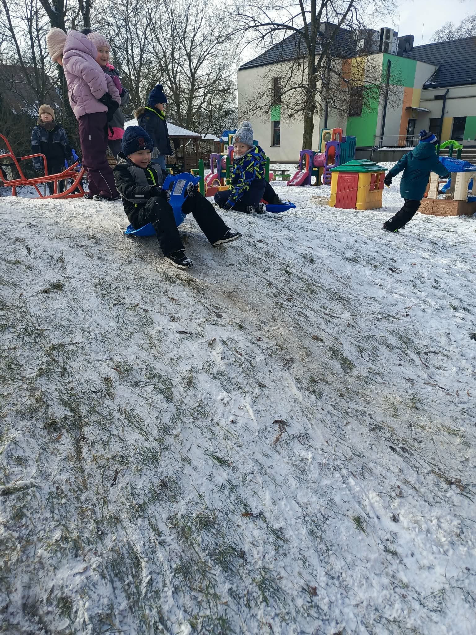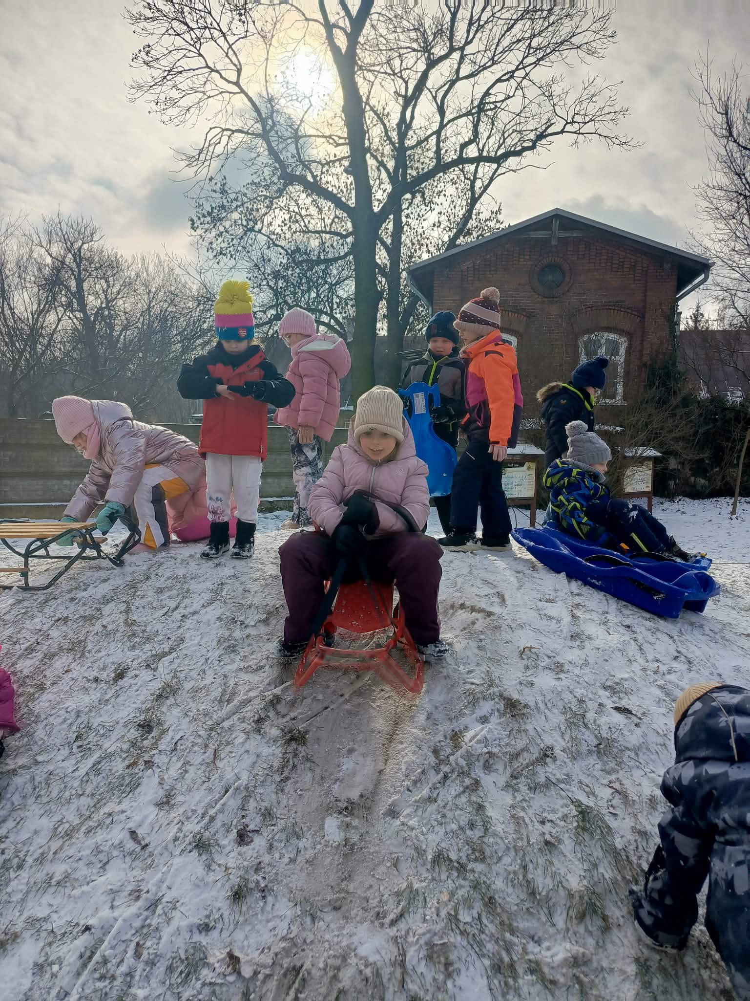Tego dnia, ciepło ubrane dzieci skorzystały z pięknej pogody za oknem i wybrały się na przedszkolny plac zabaw. Nie od dziś wiemy, że aktywność ruchowa jest potrzebna i zdrowa, a na świeżym powietrzu jest dodatkowo cenna i ekscytująca dla przedszkolaków. Główną atrakcją było zjeżdżanie na saneczkach/jabłuszkach z przedszkolnej górki, a także zabawy ruchowe. Dzieci z ogromną radością bawiły się wspólnie i aktywnie spędziły ten czas, a po zimowych zabawach, powróciły do sali na pyszny obiadek.