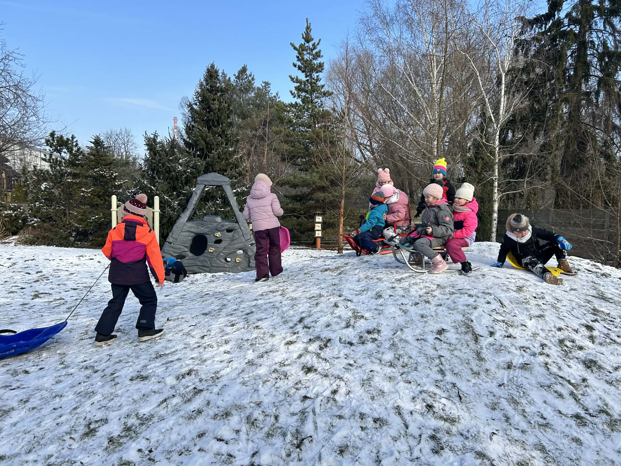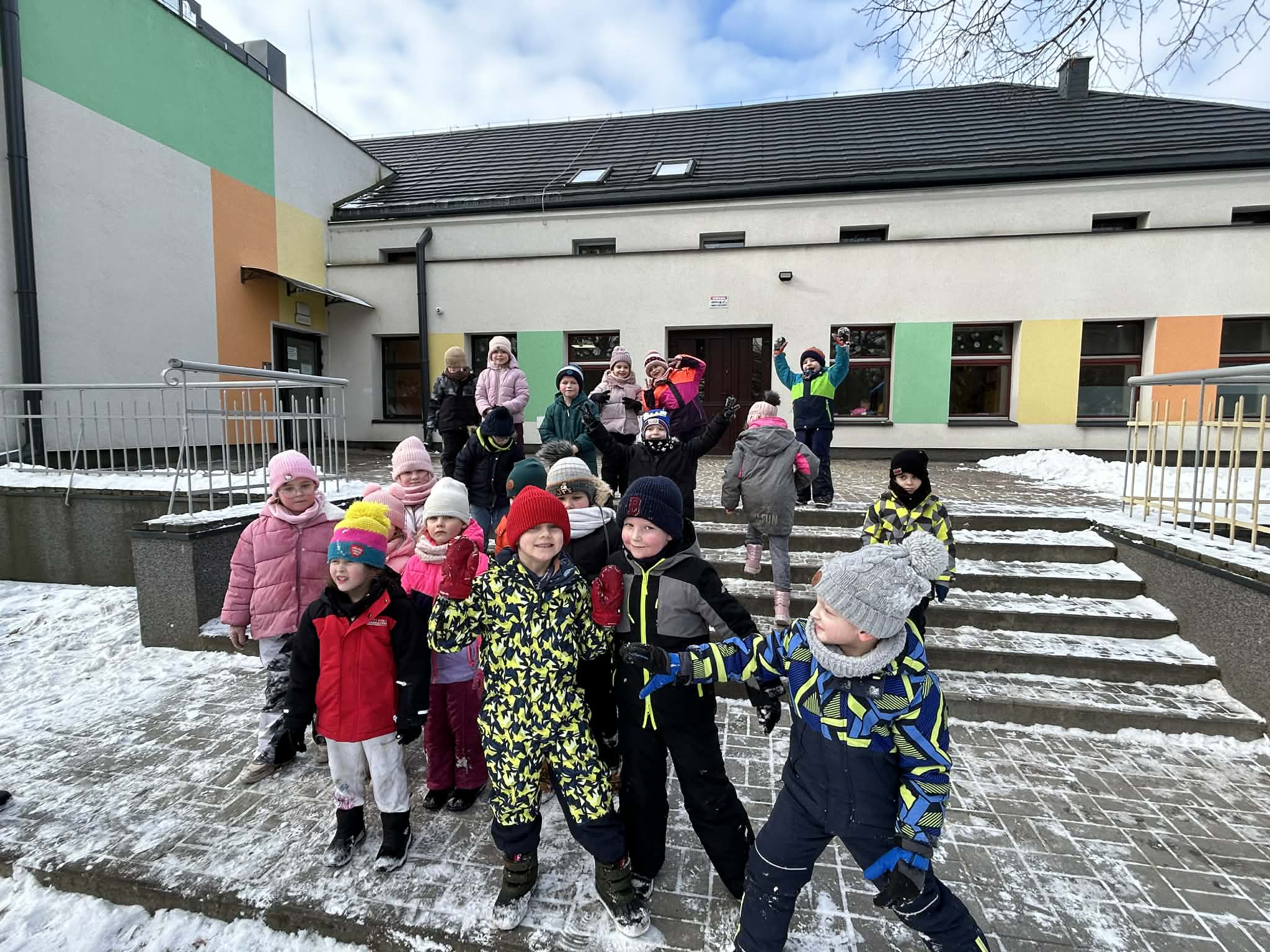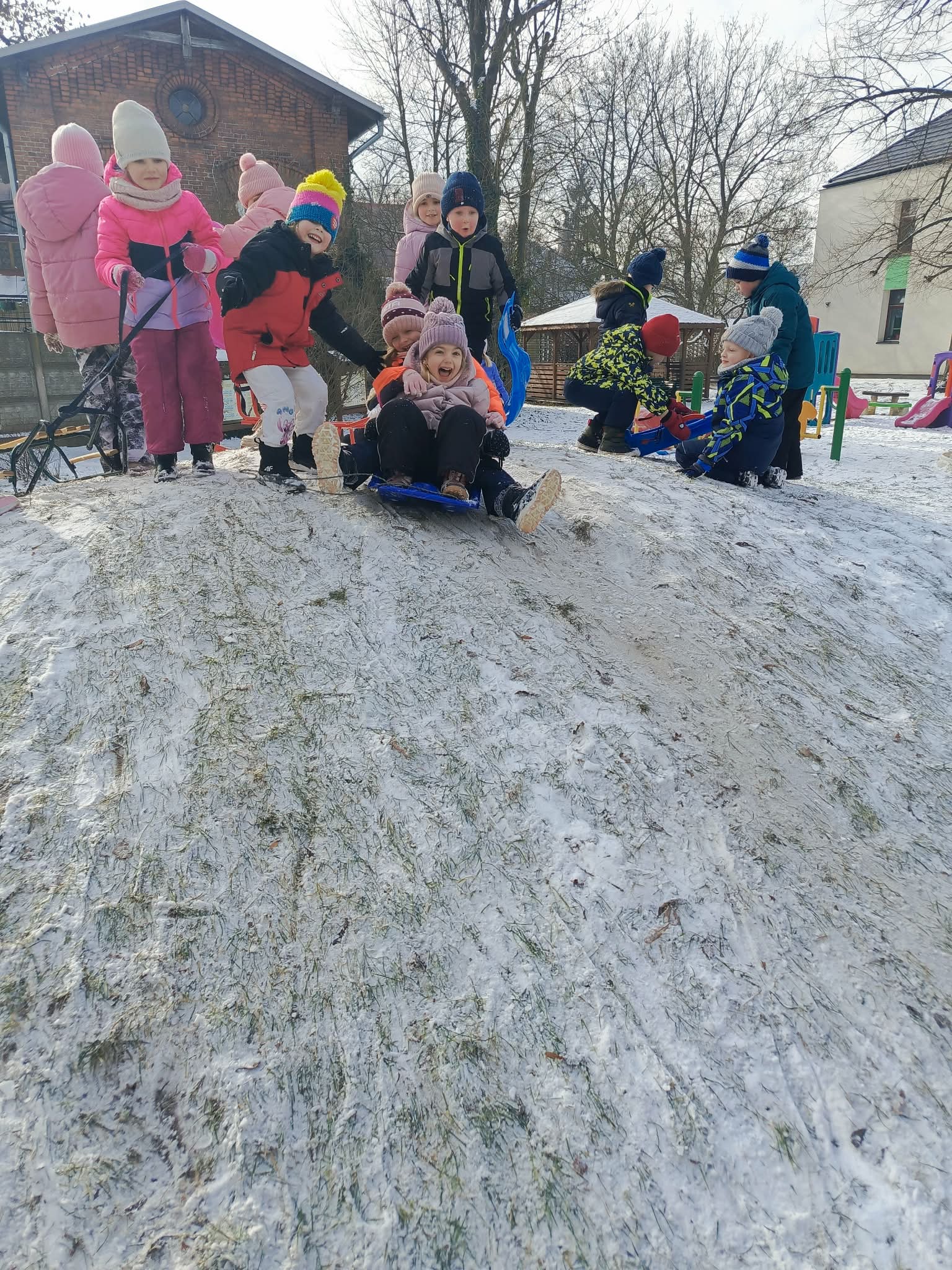 Tego dnia, ciepło ubrane dzieci skorzystały z pięknej pogody za oknem i wybrały się na przedszkolny plac zabaw. Nie od dziś wiemy, że aktywność ruchowa jest potrzebna i zdrowa, a na świeżym powietrzu jest dodatkowo cenna i ekscytująca dla przedszkolaków. Główną atrakcją było zjeżdżanie na saneczkach/jabłuszkach z przedszkolnej górki, a także zabawy ruchowe. Dzieci z ogromną radością bawiły się wspólnie i aktywnie spędziły ten czas, a po zimowych zabawach, powróciły do sali na pyszny obiadek.