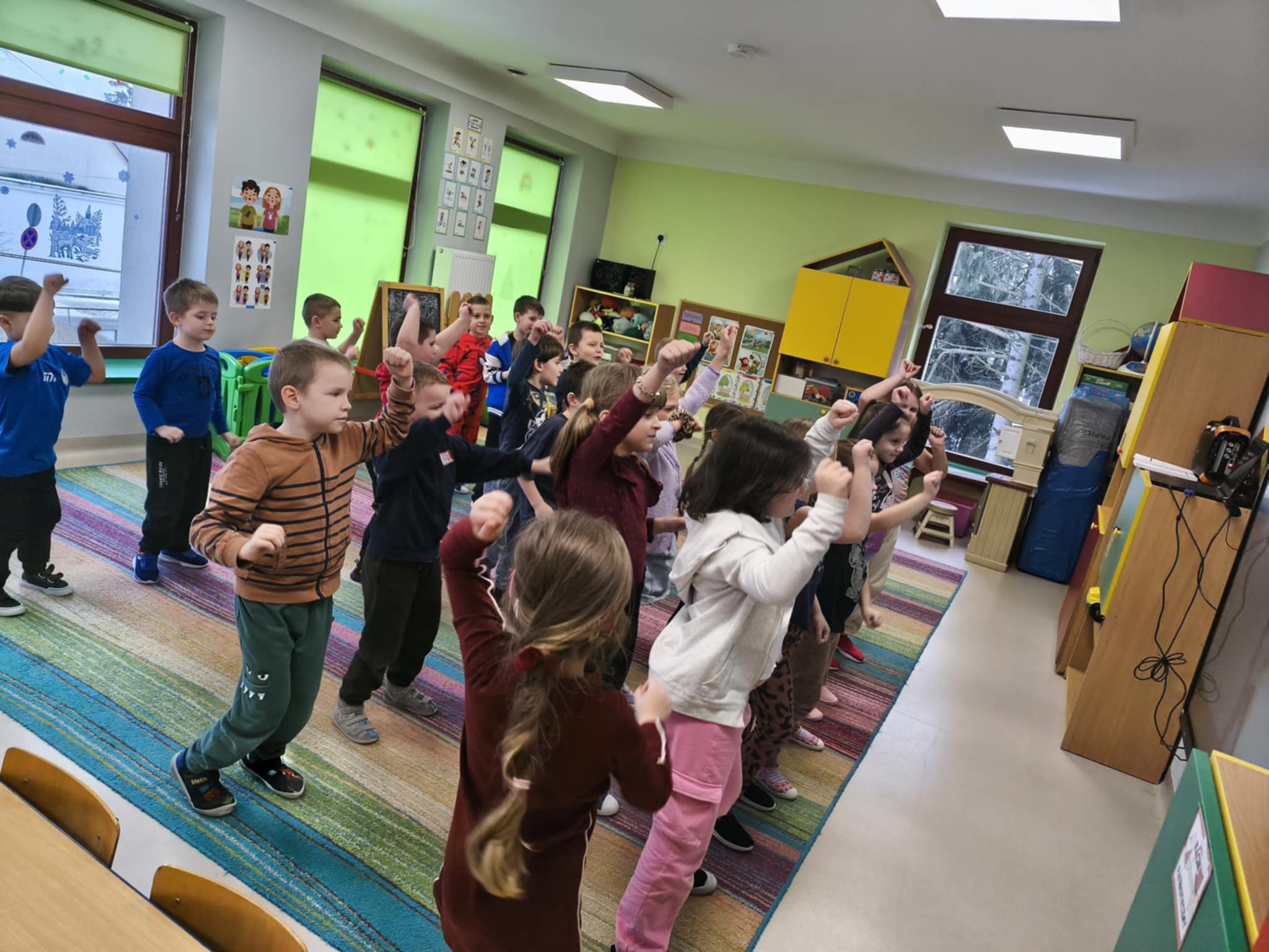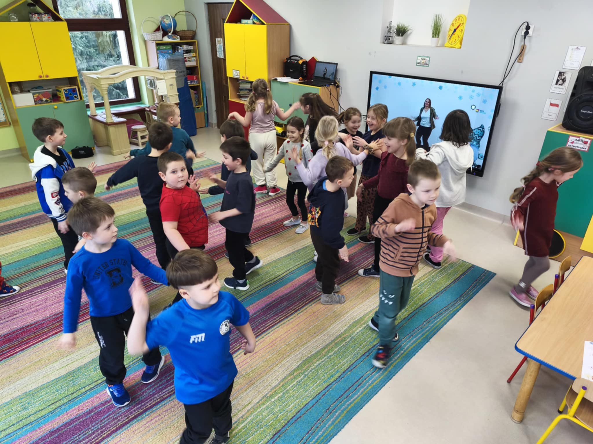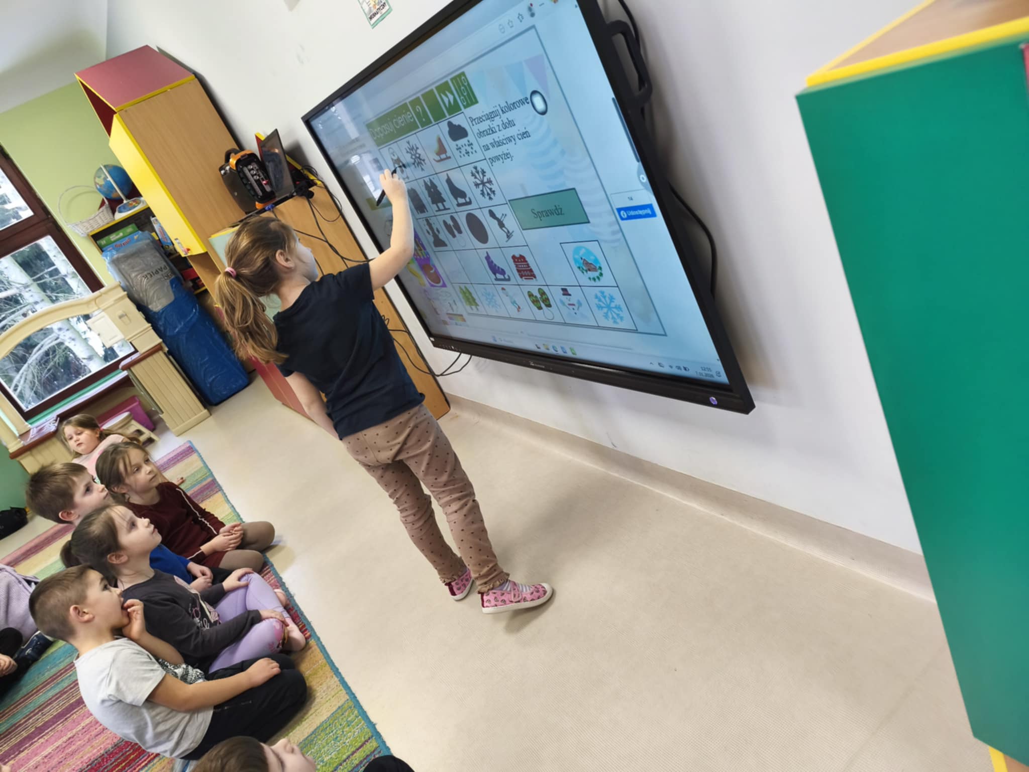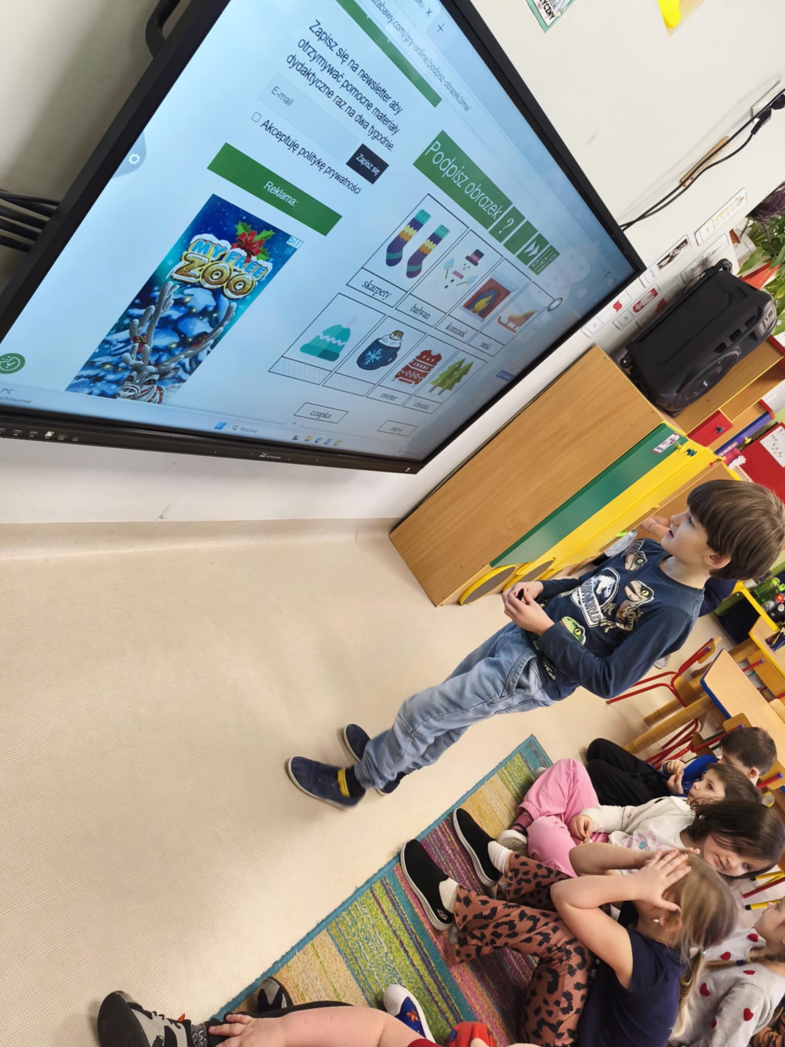 Zabawę rozpoczęliśmy od udziału w zimowej zumbie, co sprawiło dzieciom mnóstwo radości i pozwoliło na atrakcyjne połączenie muzyki i ruchu. Chwilkę później graliśmy w edukacyjne gry online na ekranie multimedialnym, podczas których ćwiczyliśmy czytanie globalne, dodawanie, odejmowanie, łączenie w pary, a to wszystko w ramach zabawy. Nieodzwonym elementem była również gra pamięciowa - zimowe memorki, również przy użyciu ekranu. Na zakończenie, korzystając z pięknej, zimowej aury, wybraliśmy się na spacer zimowy, który był idealnym sposobem na zaczęrpnięcie świeżego powietrza, odrobinę ruchu oraz wyciszenie.