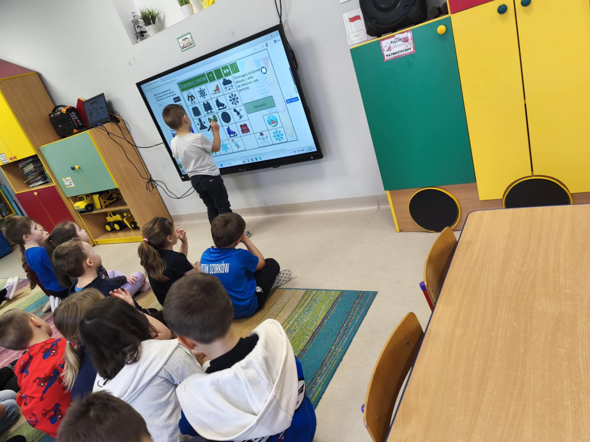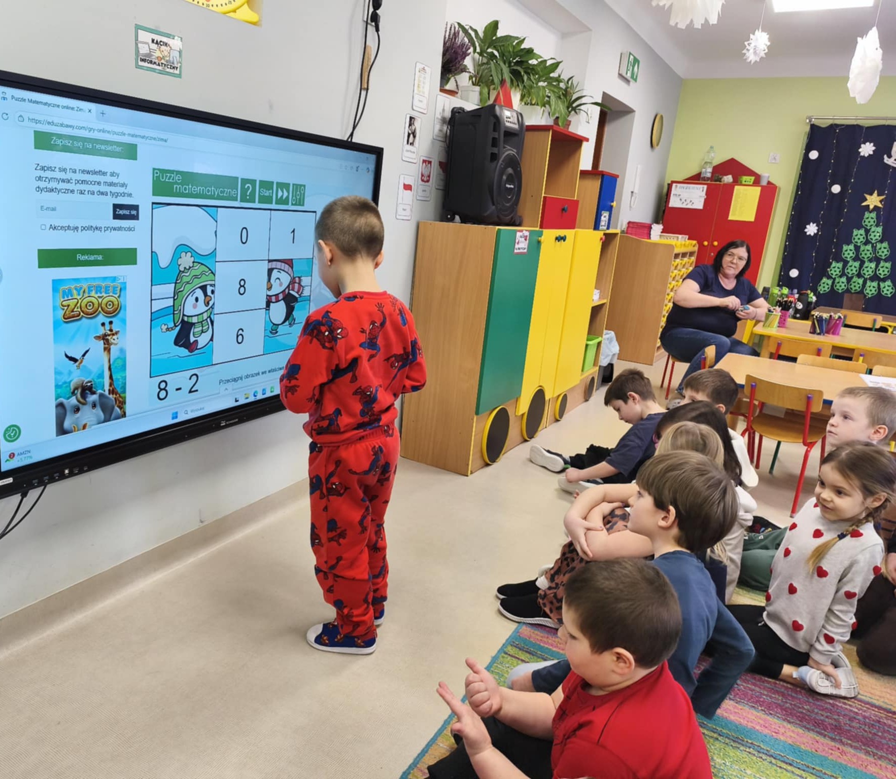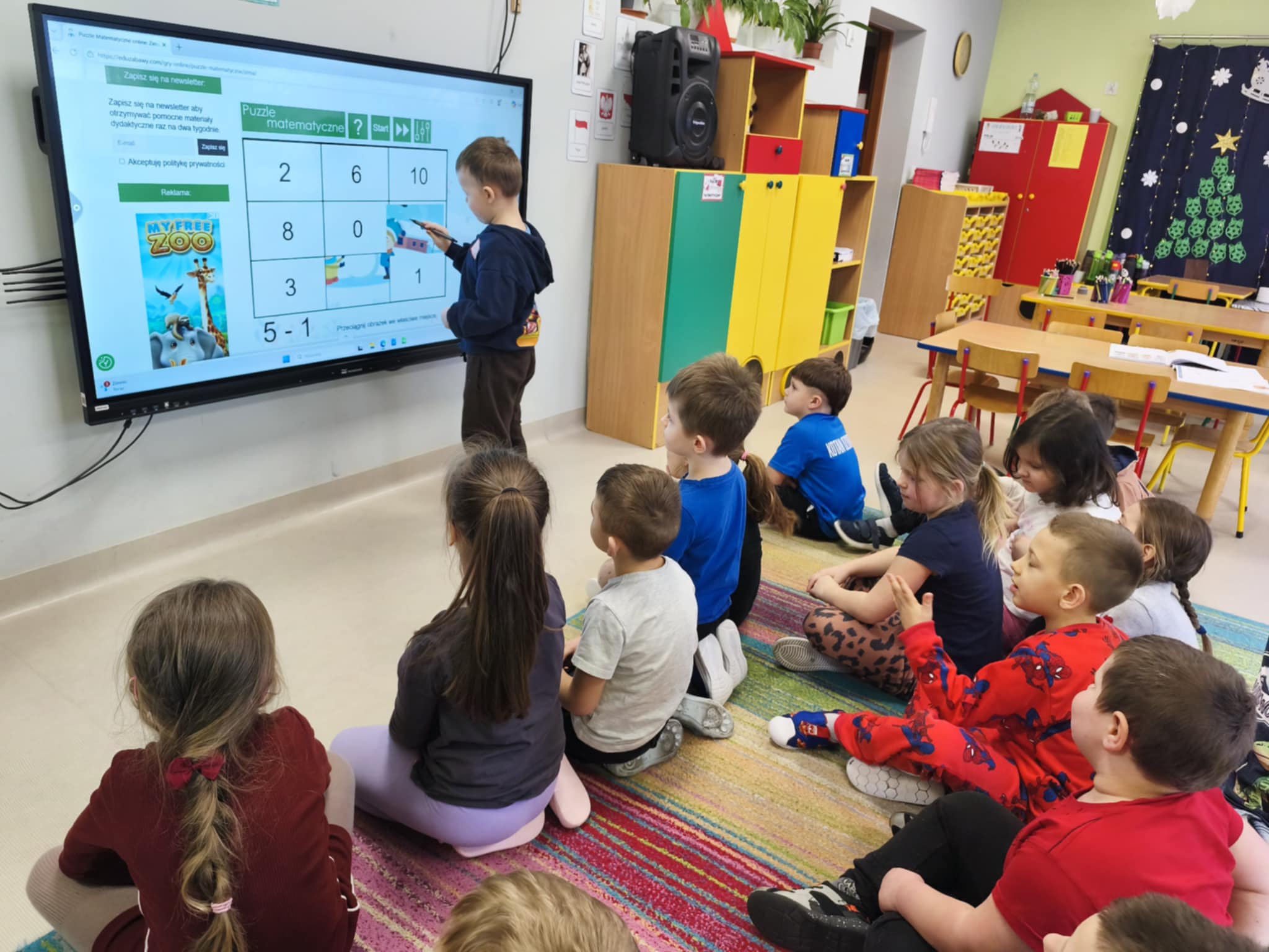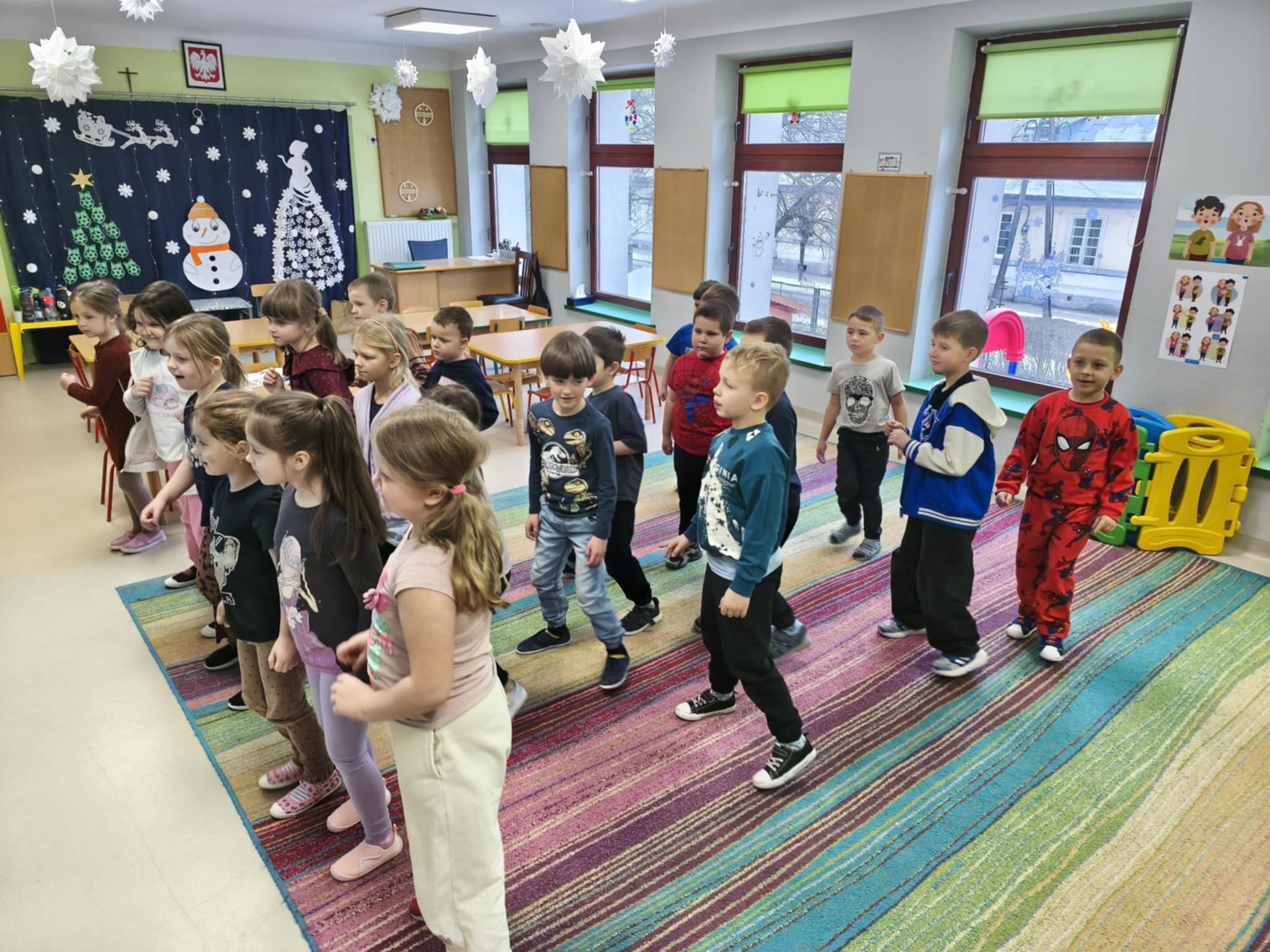 Zabawę rozpoczęliśmy od udziału w zimowej zumbie, co sprawiło dzieciom mnóstwo radości i pozwoliło na atrakcyjne połączenie muzyki i ruchu. Chwilkę później graliśmy w edukacyjne gry online na ekranie multimedialnym, podczas których ćwiczyliśmy czytanie globalne, dodawanie, odejmowanie, łączenie w pary, a to wszystko w ramach zabawy. Nieodzwonym elementem była również gra pamięciowa - zimowe memorki, również przy użyciu ekranu. Na zakończenie, korzystając z pięknej, zimowej aury, wybraliśmy się na spacer zimowy, który był idealnym sposobem na zaczęrpnięcie świeżego powietrza, odrobinę ruchu oraz wyciszenie.