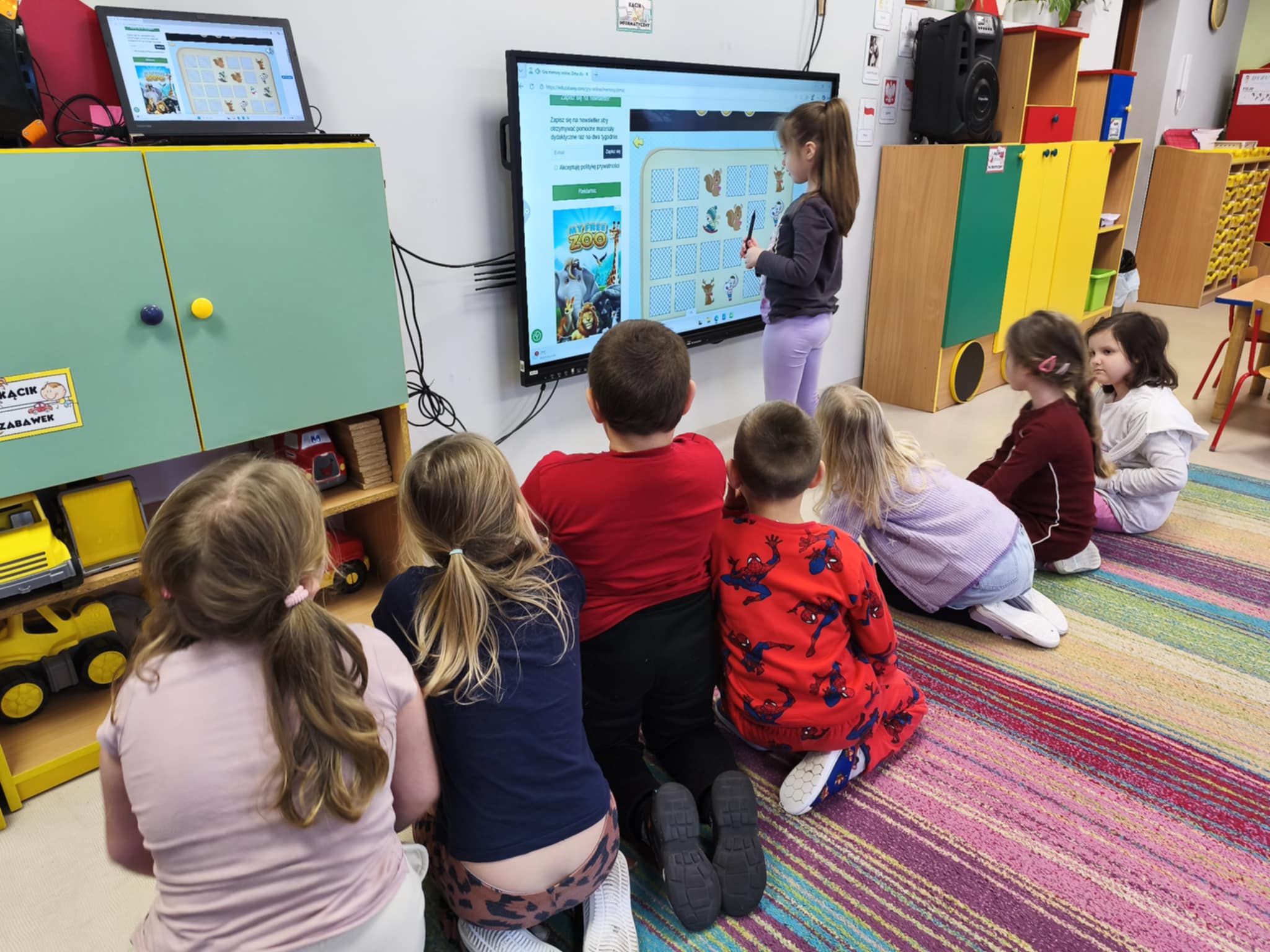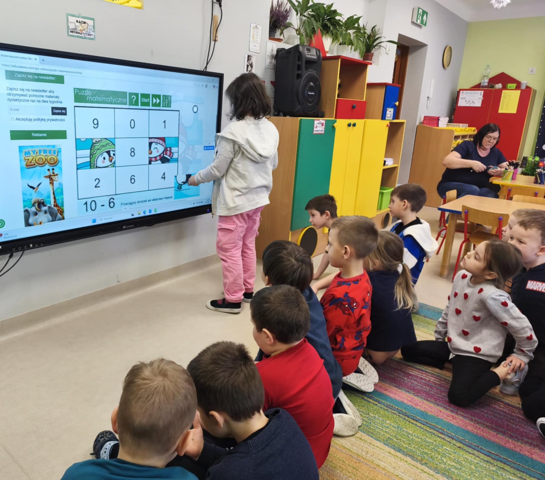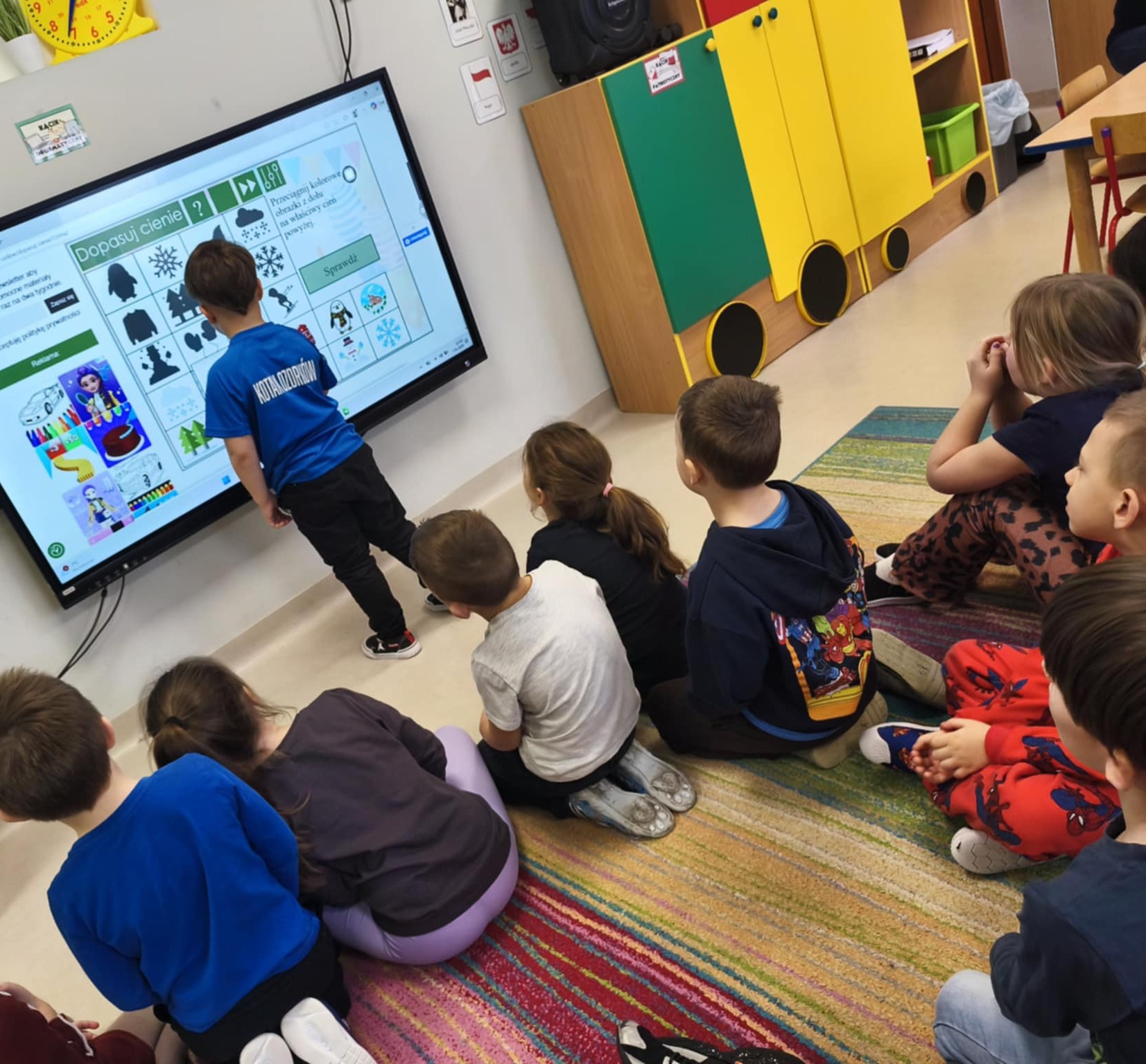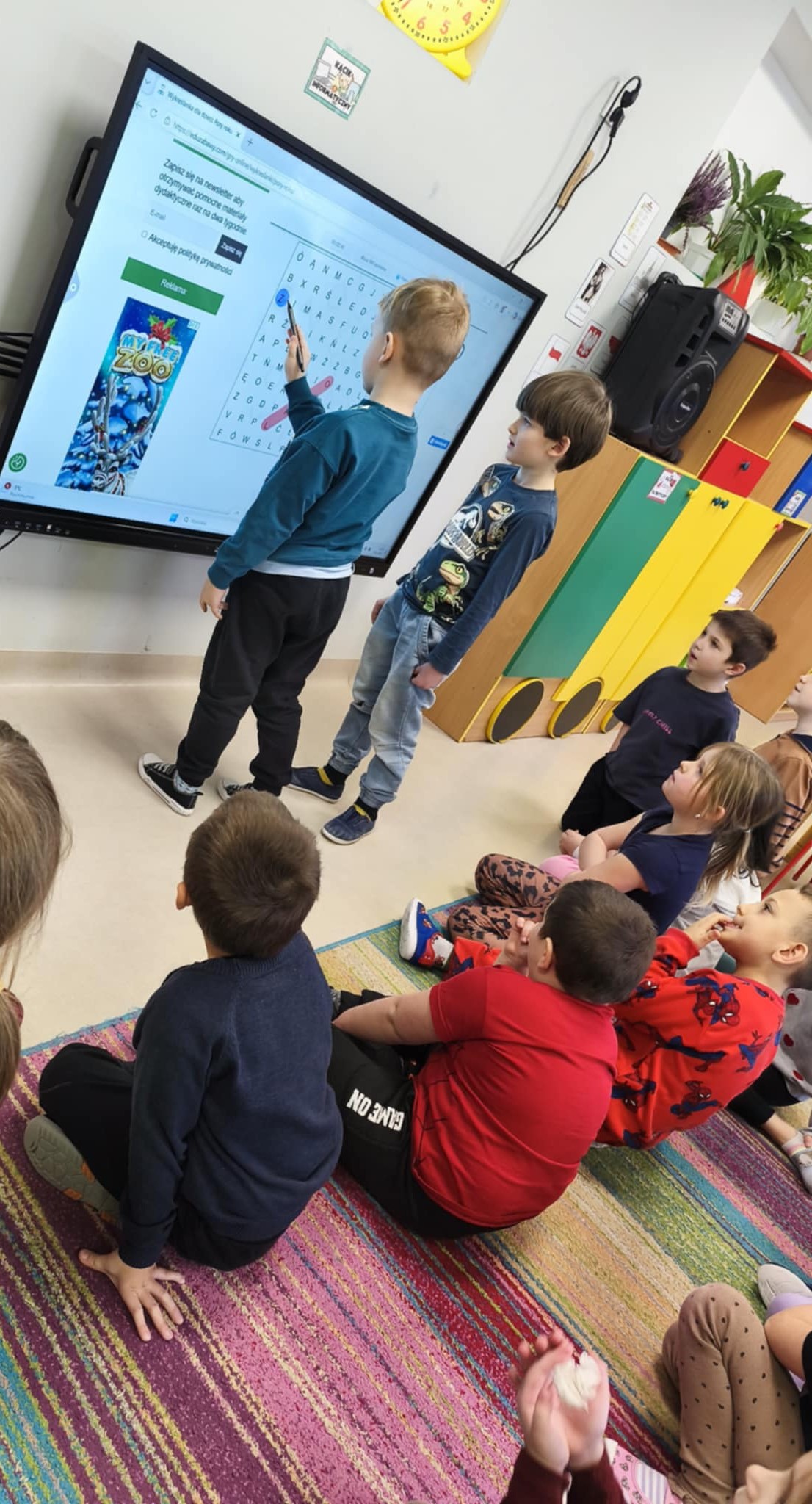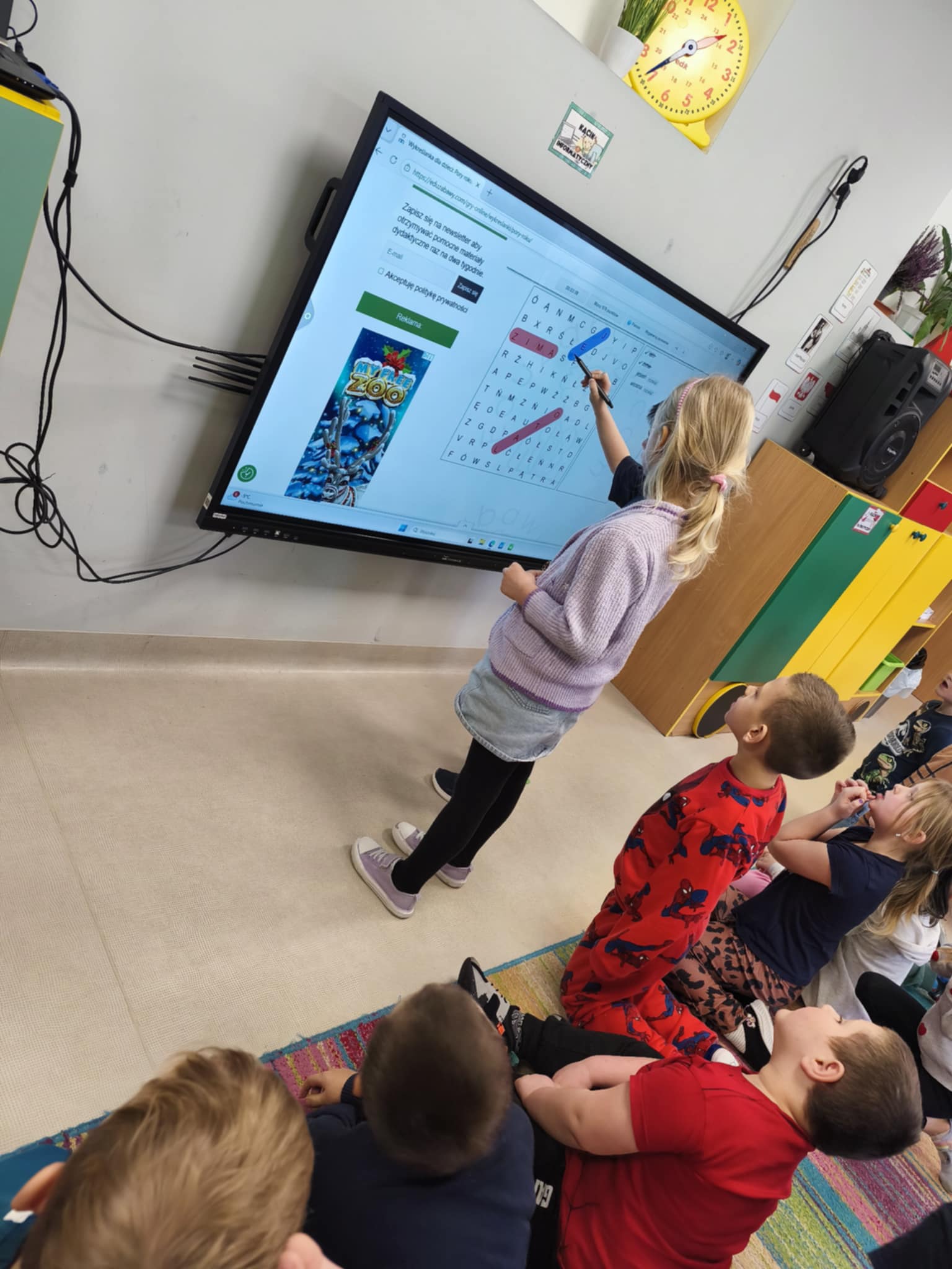 Zabawę rozpoczęliśmy od udziału w zimowej zumbie, co sprawiło dzieciom mnóstwo radości i pozwoliło na atrakcyjne połączenie muzyki i ruchu. Chwilkę później graliśmy w edukacyjne gry online na ekranie multimedialnym, podczas których ćwiczyliśmy czytanie globalne, dodawanie, odejmowanie, łączenie w pary, a to wszystko w ramach zabawy. Nieodzwonym elementem była również gra pamięciowa - zimowe memorki, również przy użyciu ekranu. Na zakończenie, korzystając z pięknej, zimowej aury, wybraliśmy się na spacer zimowy, który był idealnym sposobem na zaczęrpnięcie świeżego powietrza, odrobinę ruchu oraz wyciszenie.
