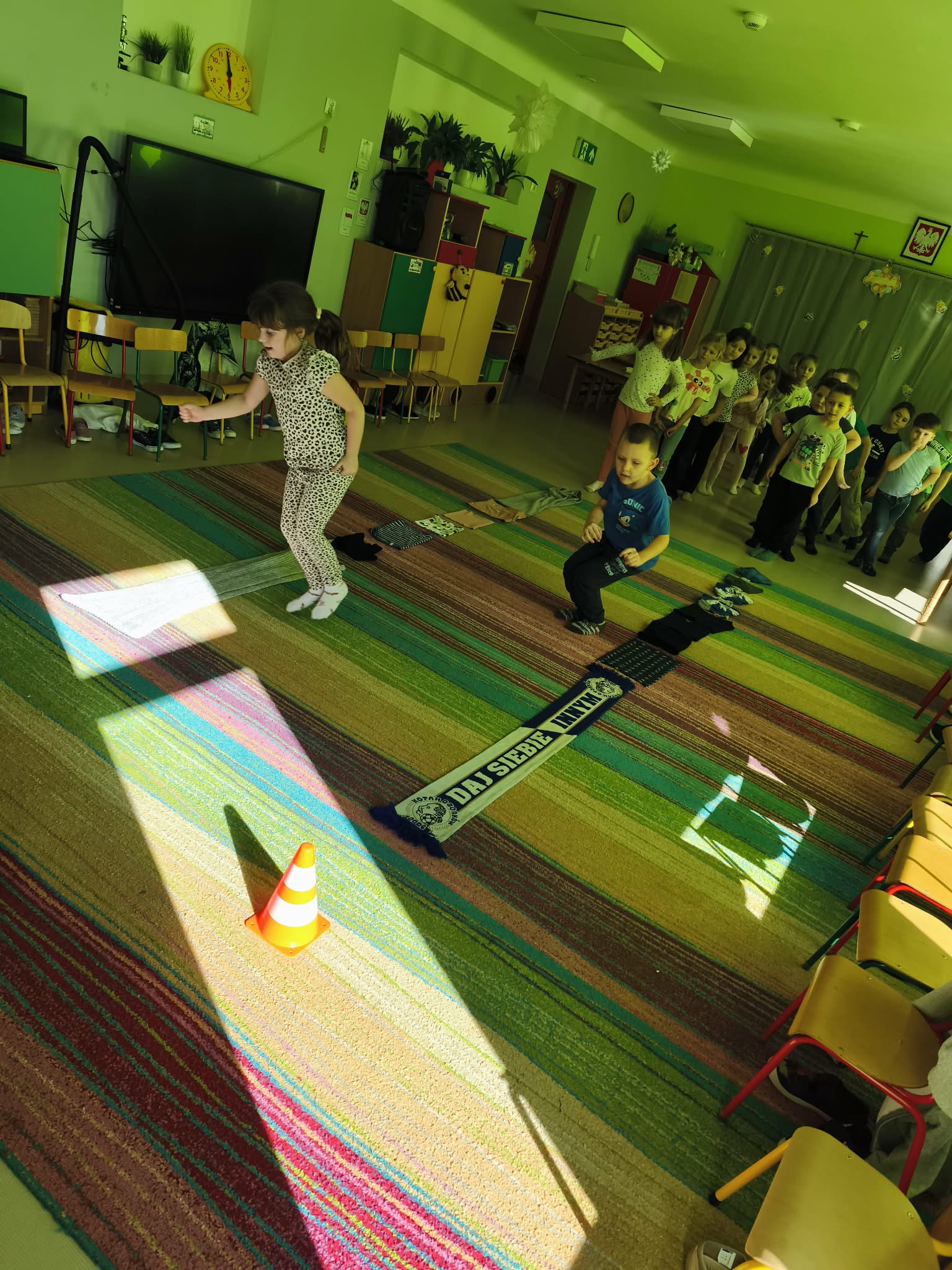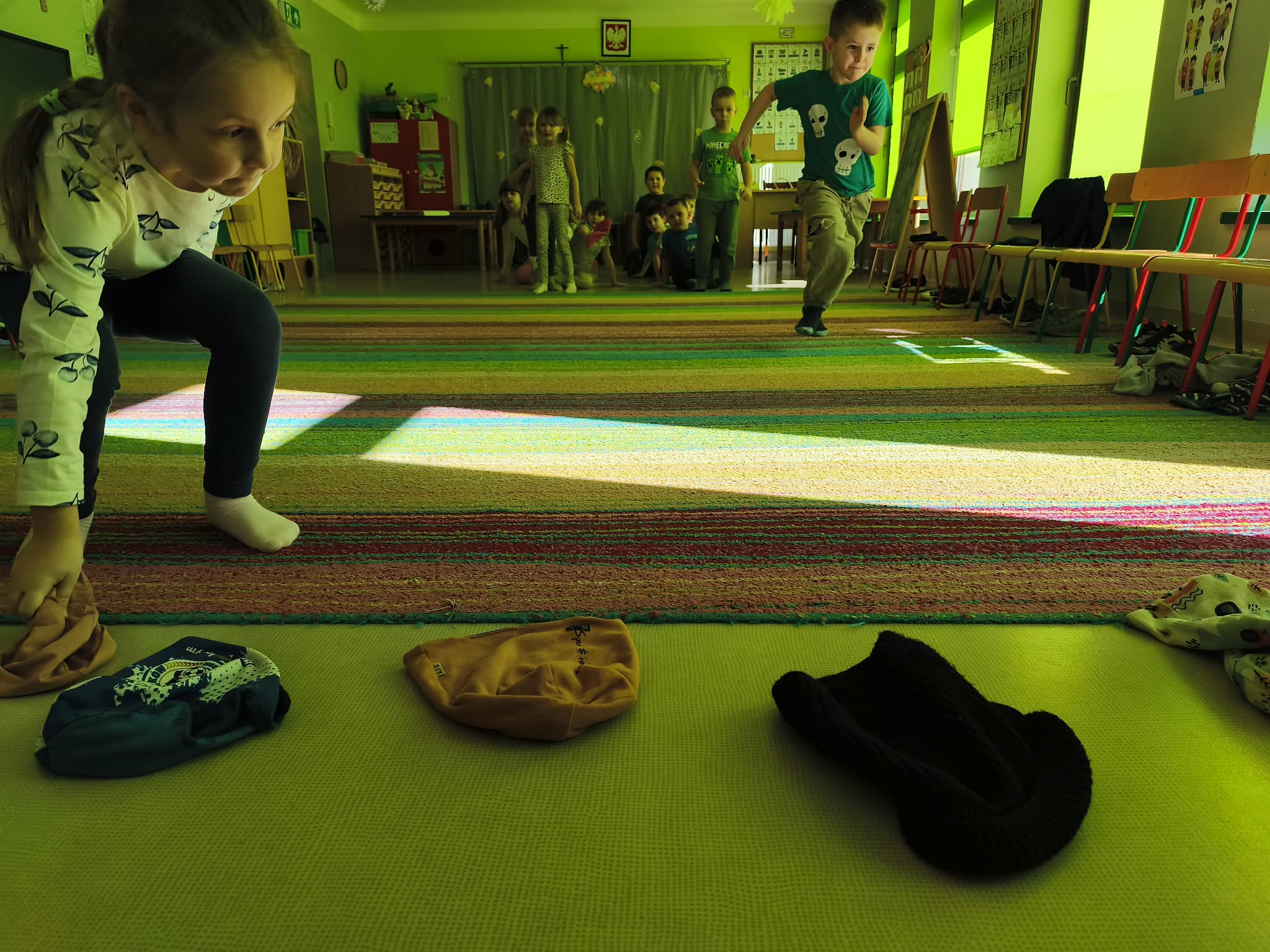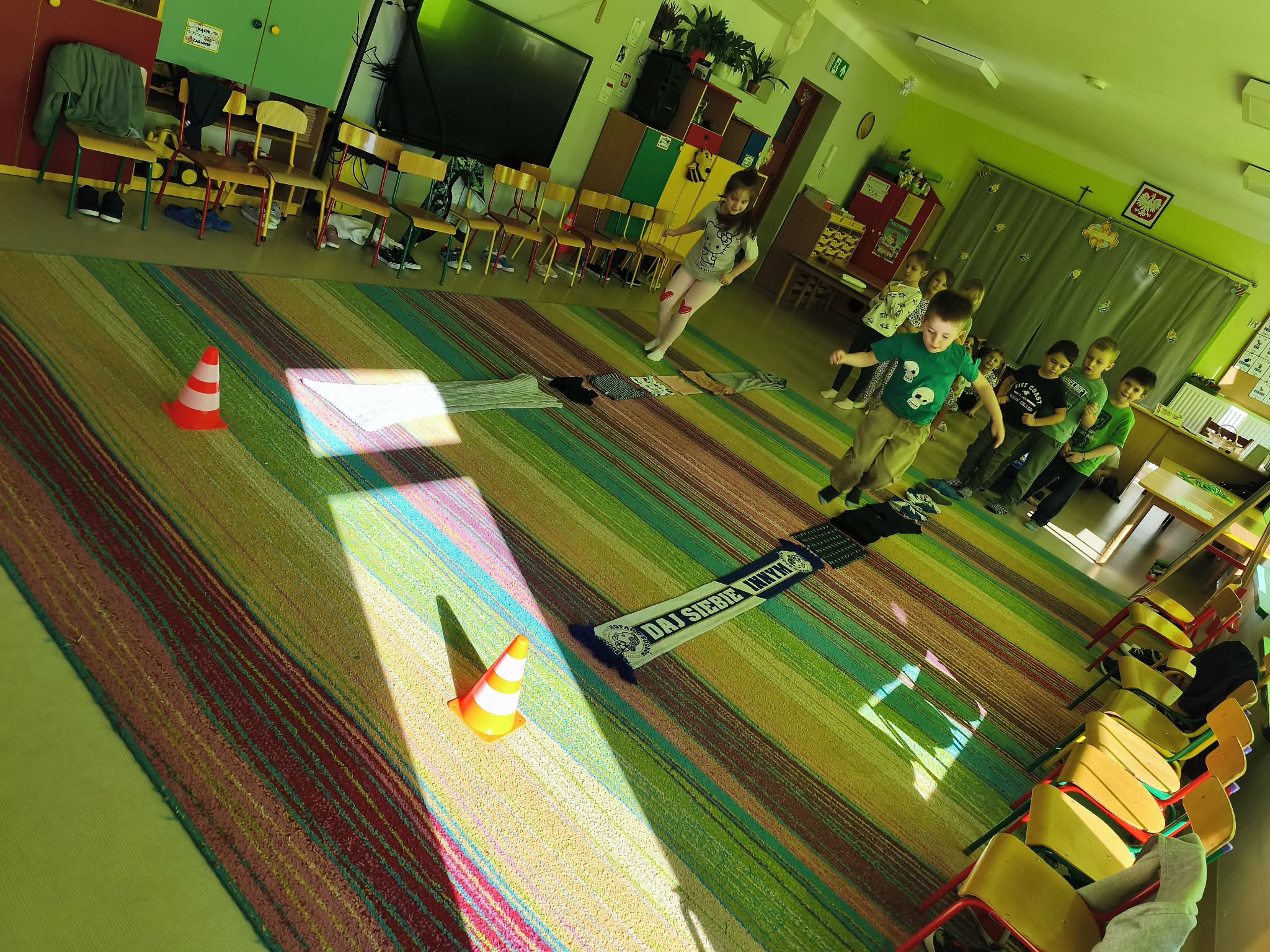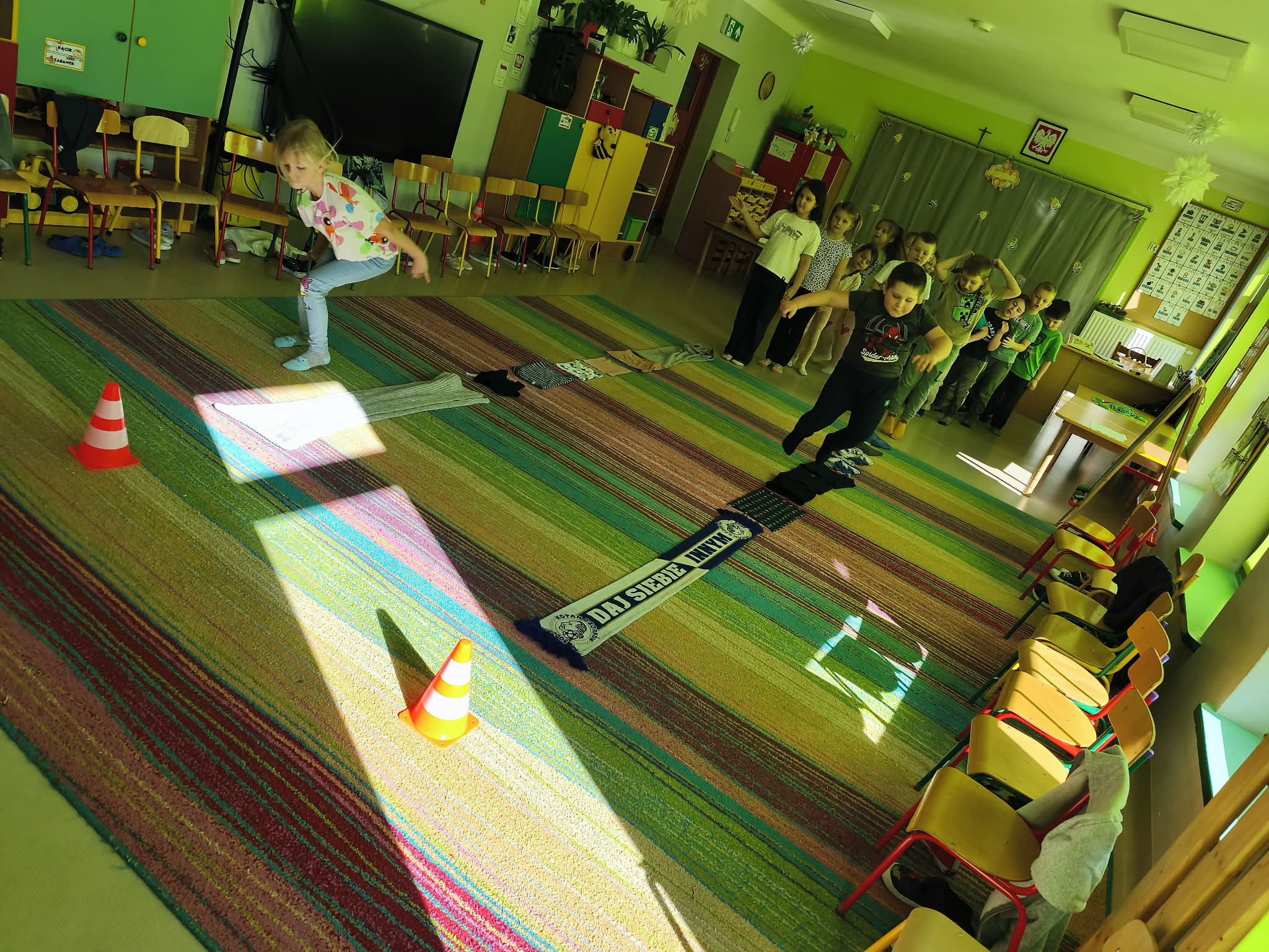 Głównym celem zajęć było zachęcenie starszaków do aktywności ruchowej, a także utrwalanie nawyku przestrzegania zasad. Dodatkowo ćwiczyliśmy również współpracę w zespołach i umiejętność słuchania poleceń złożonych, a to wszystko w ramach zabawy. Zanim przystąpiliśmy do zawodów, dzieci przygotowały salę, przyniosły czapki, szaliki, zdjęły bluzy i buciki przedszkolne, a także napiły się wody. Po podzieleniu grupy na dwa zespoły, przedszkolaki wzięły udział w czterech konkurencjach sportowych: "Bierz czapkę", "Szalikowe skoki", "Toczy się śnieżna kula" oraz "Spacer ze śnieżynką", zwracając uwagę na tempo i dokładność wykonania zadania. Podczas ich wykonywania rozwijaliśmy takie umiejętności, jak: szybkość, skoczność, uważność i koncentrację uwagi. Na koniec podsumowaliśmy punkty i obie drużyny zremisowały 3:3, za co wszyscy otrzymali pamiątkowe stempelki. Zaproponowane aktywności sprawiły dzieciom dużo radości, ale też były uwielbianą przez nich formą aktywności ruchowej i rywalizacji w duchu fair-play. "Bo liczy się sport i dobra zabawa!". Po zajęciach, przedszkolaki posprzątały przybory i przygotowały salę do podwieczorku oraz napiły się wody, a chętne osoby usiadły do stolika, by tam za pomocą kulek z papieru oraz białej farby namalować wspólną pracę pt. "Zima nocą".