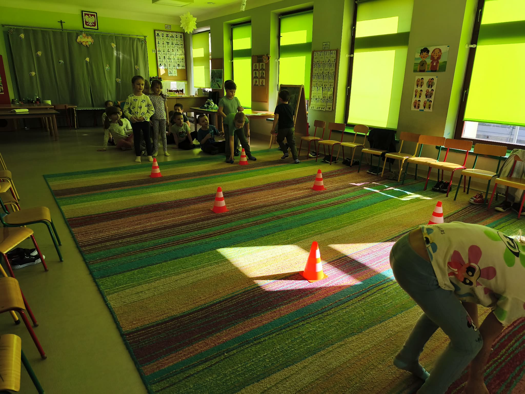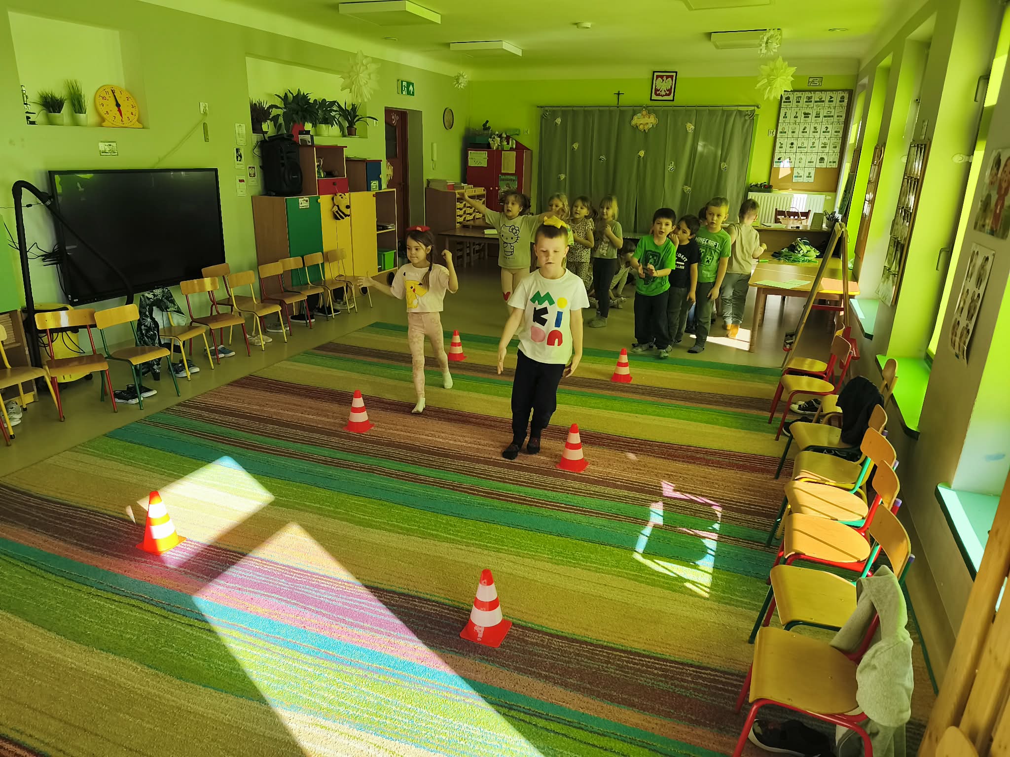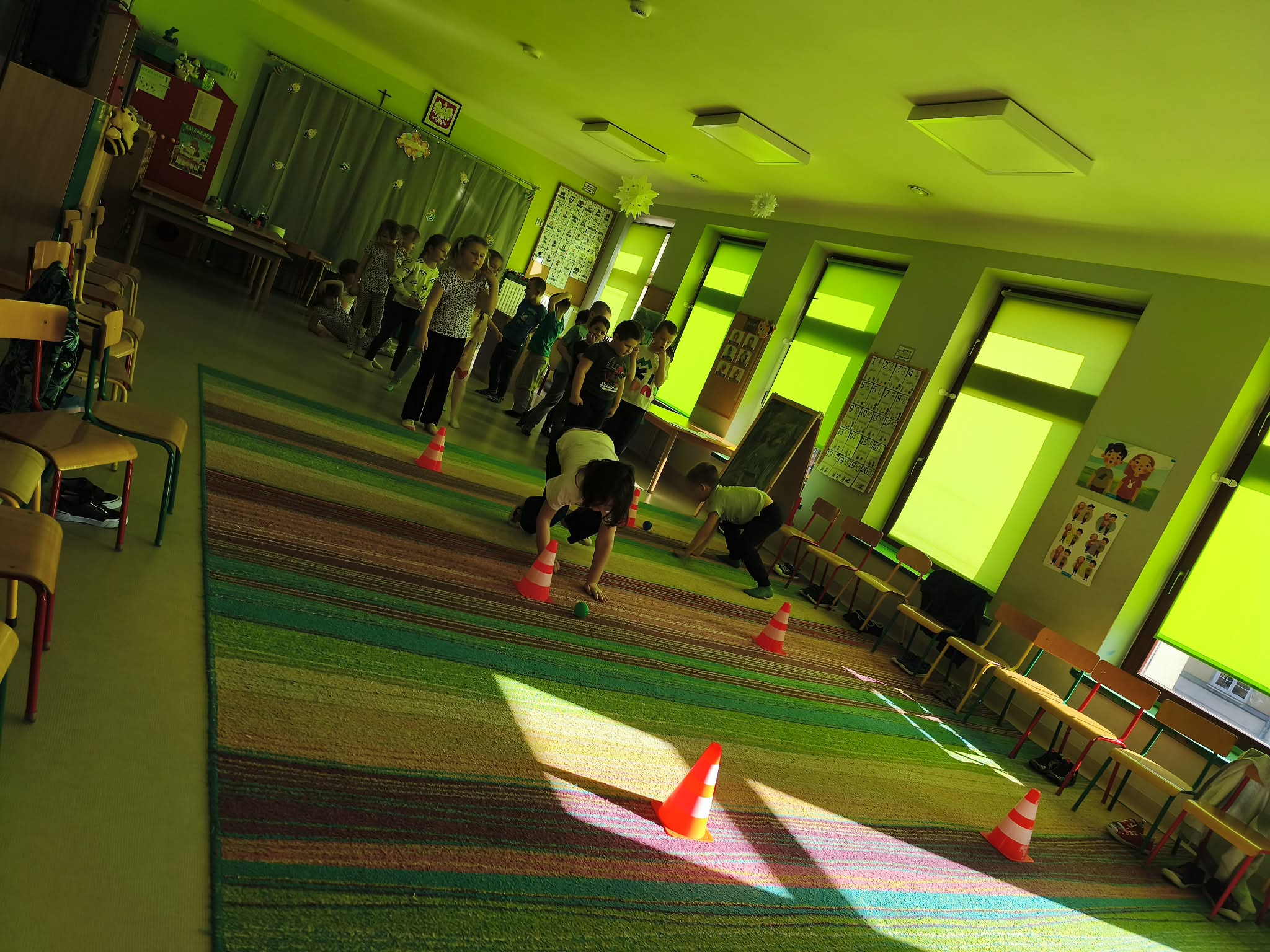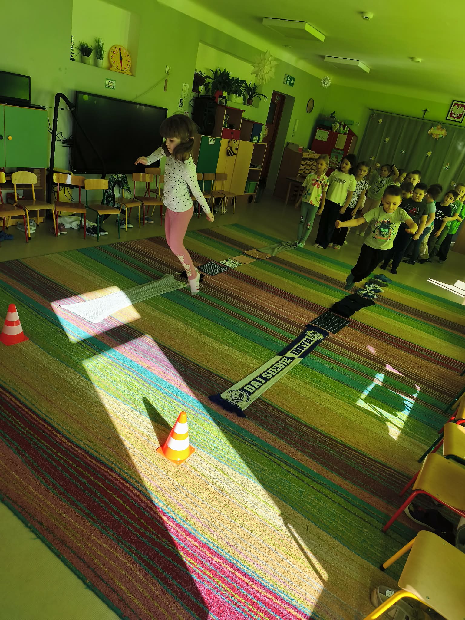 Głównym celem zajęć było zachęcenie starszaków do aktywności ruchowej, a także utrwalanie nawyku przestrzegania zasad. Dodatkowo ćwiczyliśmy również współpracę w zespołach i umiejętność słuchania poleceń złożonych, a to wszystko w ramach zabawy. Zanim przystąpiliśmy do zawodów, dzieci przygotowały salę, przyniosły czapki, szaliki, zdjęły bluzy i buciki przedszkolne, a także napiły się wody. Po podzieleniu grupy na dwa zespoły, przedszkolaki wzięły udział w czterech konkurencjach sportowych: "Bierz czapkę", "Szalikowe skoki", "Toczy się śnieżna kula" oraz "Spacer ze śnieżynką", zwracając uwagę na tempo i dokładność wykonania zadania. Podczas ich wykonywania rozwijaliśmy takie umiejętności, jak: szybkość, skoczność, uważność i koncentrację uwagi. Na koniec podsumowaliśmy punkty i obie drużyny zremisowały 3:3, za co wszyscy otrzymali pamiątkowe stempelki. Zaproponowane aktywności sprawiły dzieciom dużo radości, ale też były uwielbianą przez nich formą aktywności ruchowej i rywalizacji w duchu fair-play. "Bo liczy się sport i dobra zabawa!". Po zajęciach, przedszkolaki posprzątały przybory i przygotowały salę do podwieczorku oraz napiły się wody, a chętne osoby usiadły do stolika, by tam za pomocą kulek z papieru oraz białej farby namalować wspólną pracę pt. "Zima nocą".