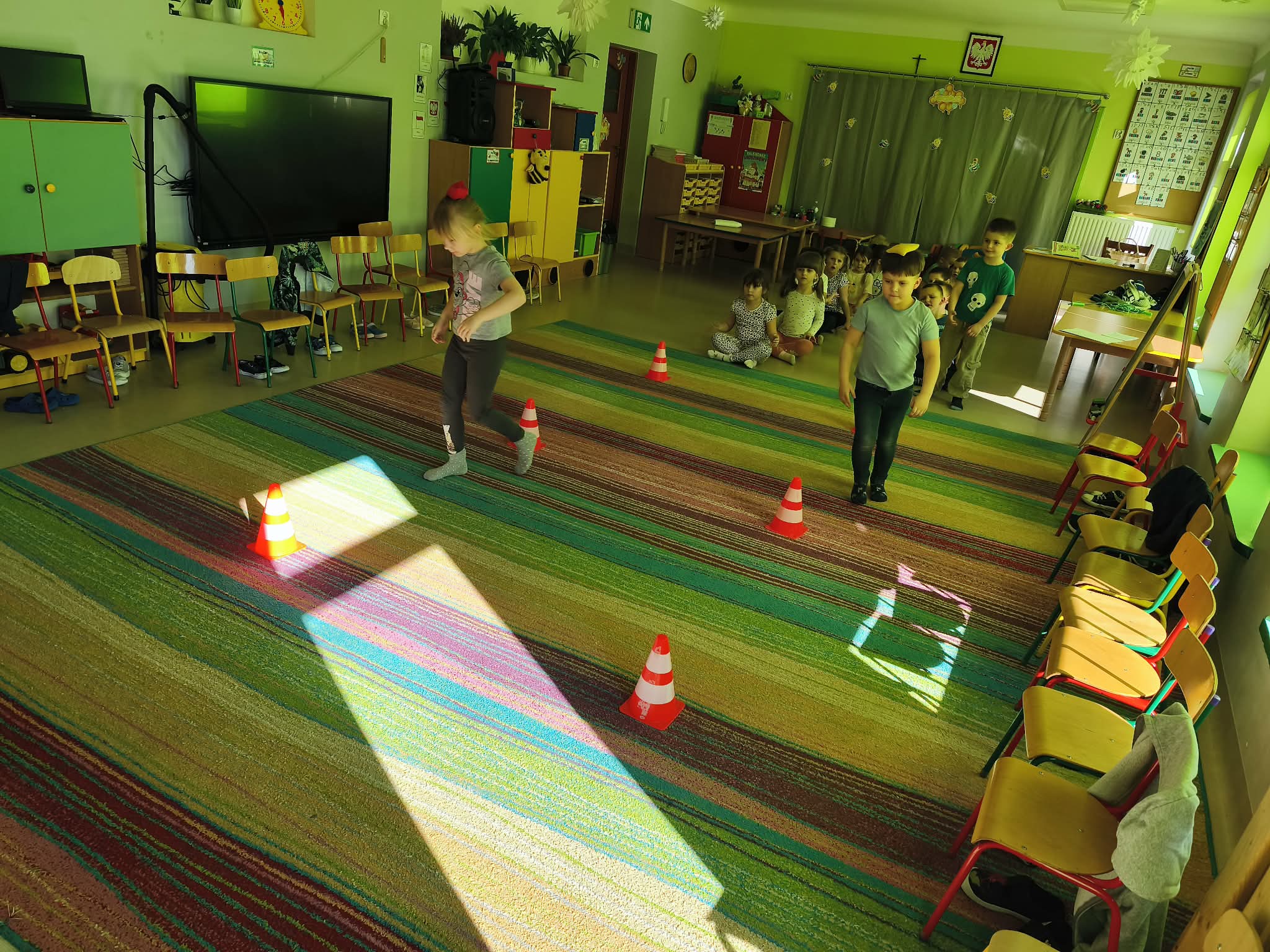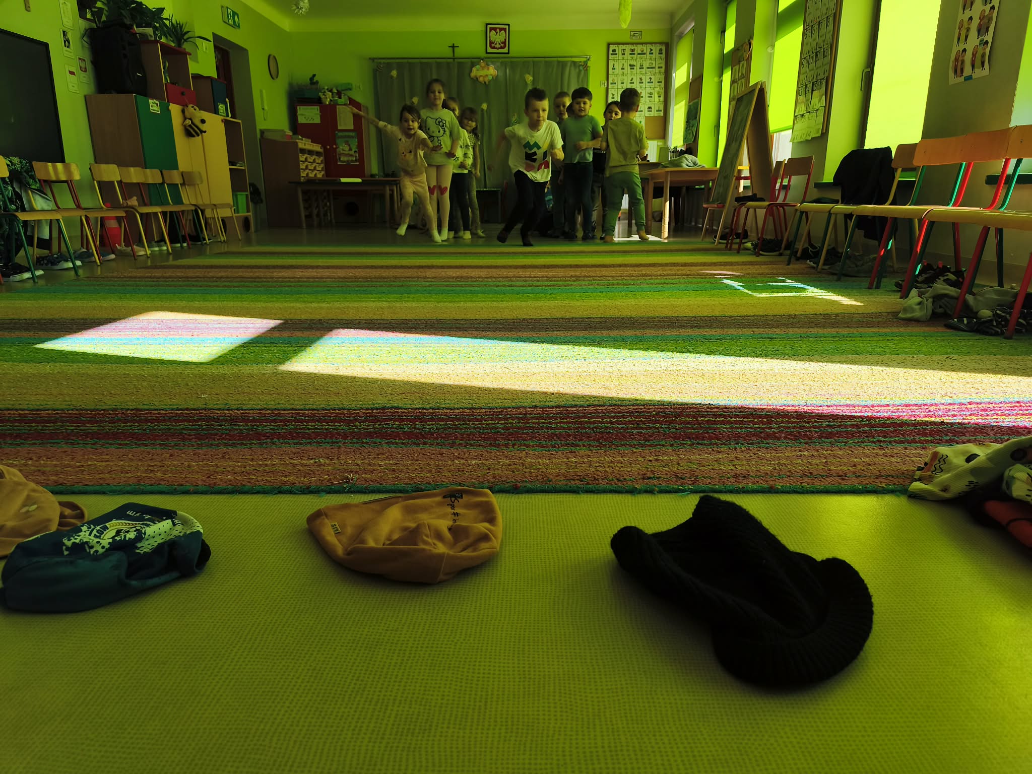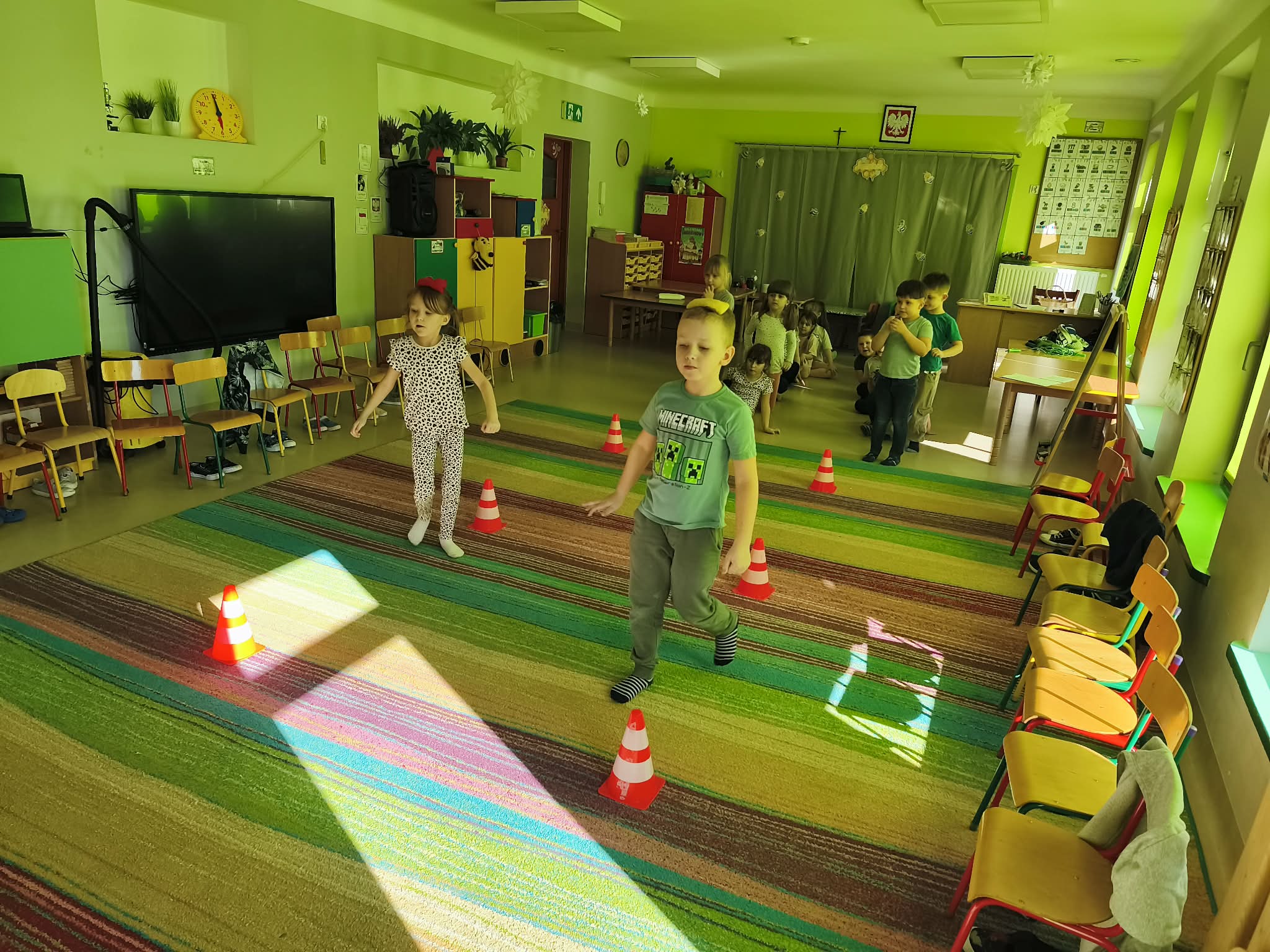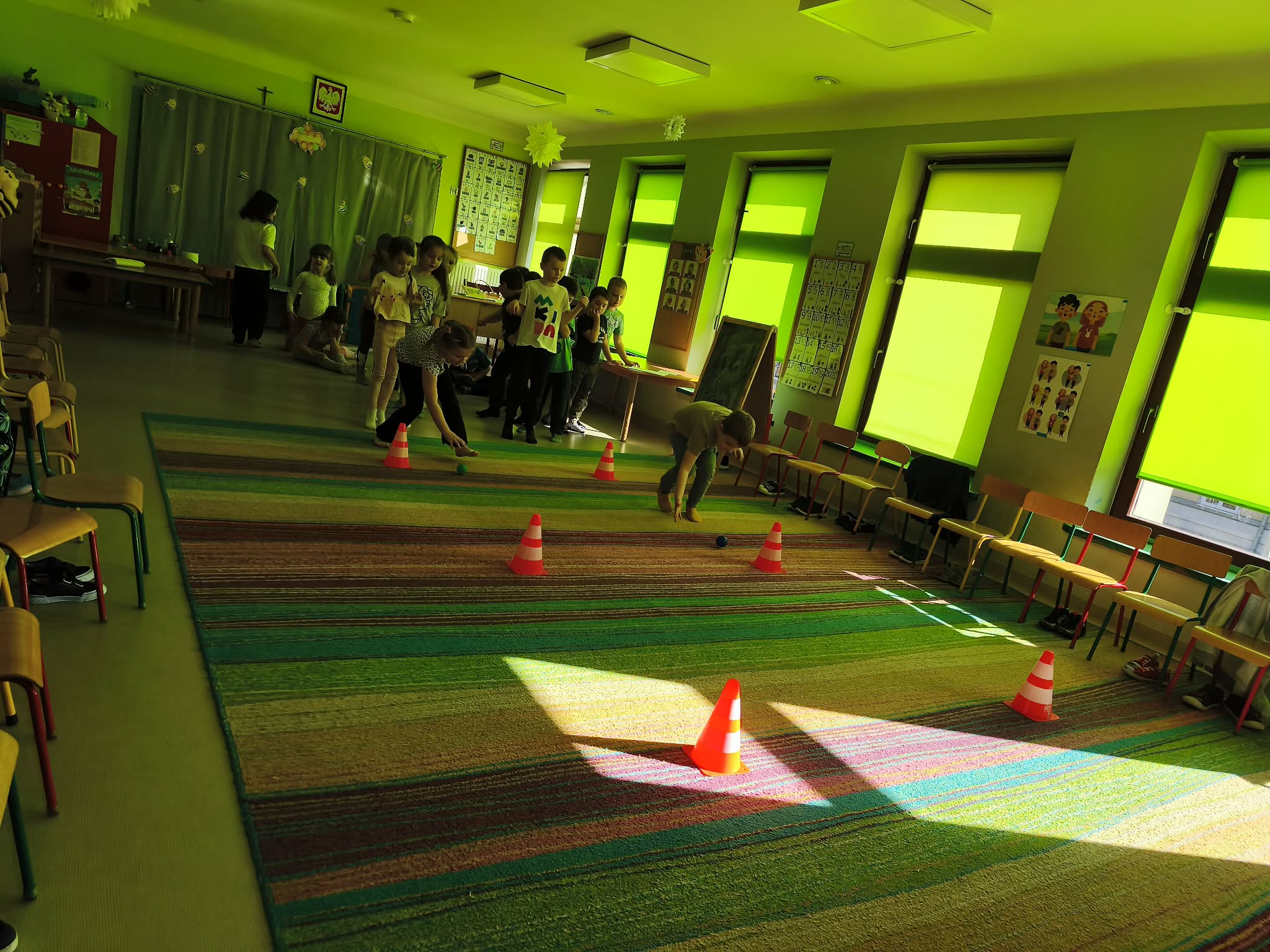 Głównym celem zajęć było zachęcenie starszaków do aktywności ruchowej, a także utrwalanie nawyku przestrzegania zasad. Dodatkowo ćwiczyliśmy również współpracę w zespołach i umiejętność słuchania poleceń złożonych, a to wszystko w ramach zabawy. Zanim przystąpiliśmy do zawodów, dzieci przygotowały salę, przyniosły czapki, szaliki, zdjęły bluzy i buciki przedszkolne, a także napiły się wody. Po podzieleniu grupy na dwa zespoły, przedszkolaki wzięły udział w czterech konkurencjach sportowych: "Bierz czapkę", "Szalikowe skoki", "Toczy się śnieżna kula" oraz "Spacer ze śnieżynką", zwracając uwagę na tempo i dokładność wykonania zadania. Podczas ich wykonywania rozwijaliśmy takie umiejętności, jak: szybkość, skoczność, uważność i koncentrację uwagi. Na koniec podsumowaliśmy punkty i obie drużyny zremisowały 3:3, za co wszyscy otrzymali pamiątkowe stempelki. Zaproponowane aktywności sprawiły dzieciom dużo radości, ale też były uwielbianą przez nich formą aktywności ruchowej i rywalizacji w duchu fair-play. "Bo liczy się sport i dobra zabawa!". Po zajęciach, przedszkolaki posprzątały przybory i przygotowały salę do podwieczorku oraz napiły się wody, a chętne osoby usiadły do stolika, by tam za pomocą kulek z papieru oraz białej farby namalować wspólną pracę pt. "Zima nocą".