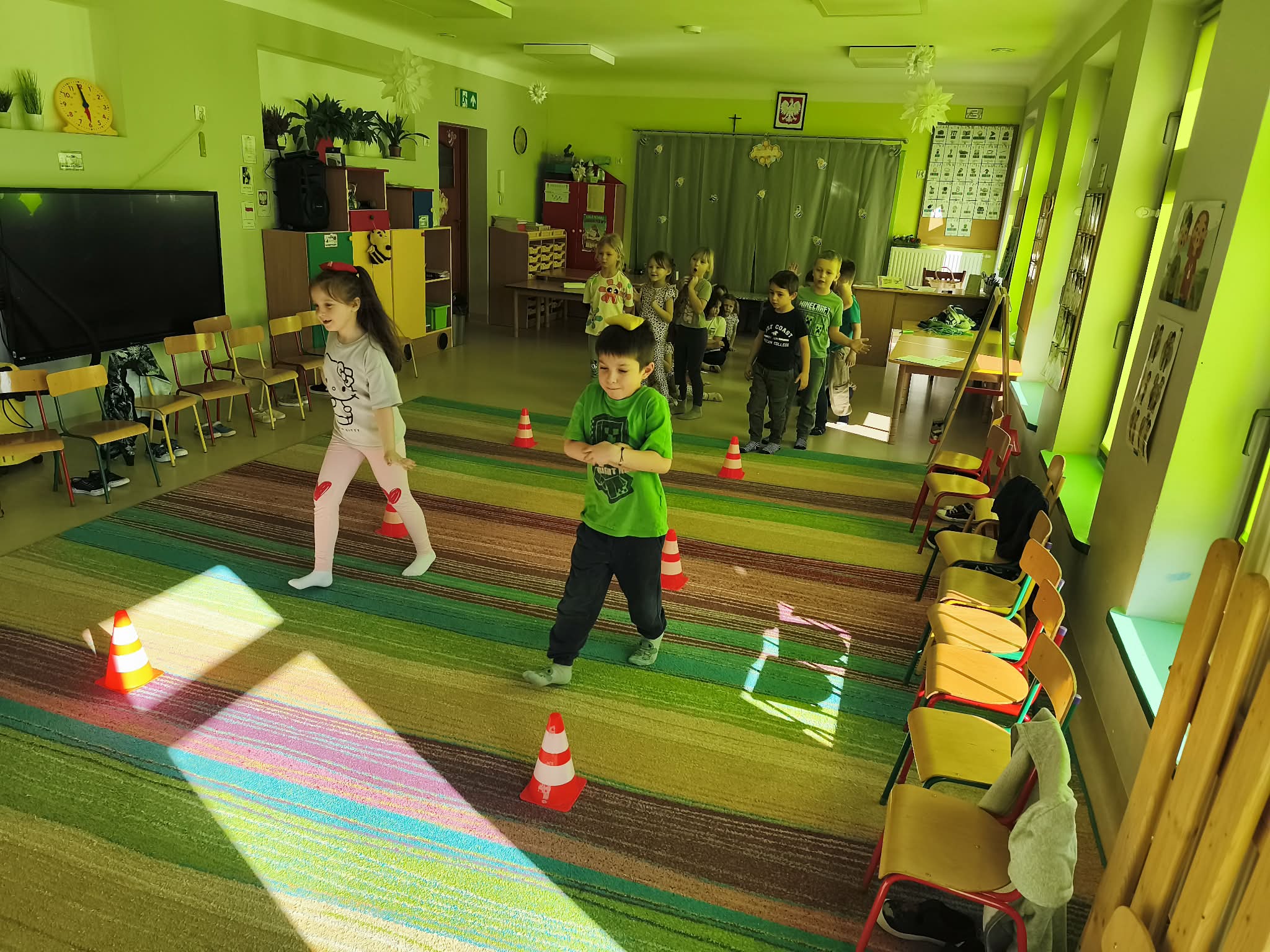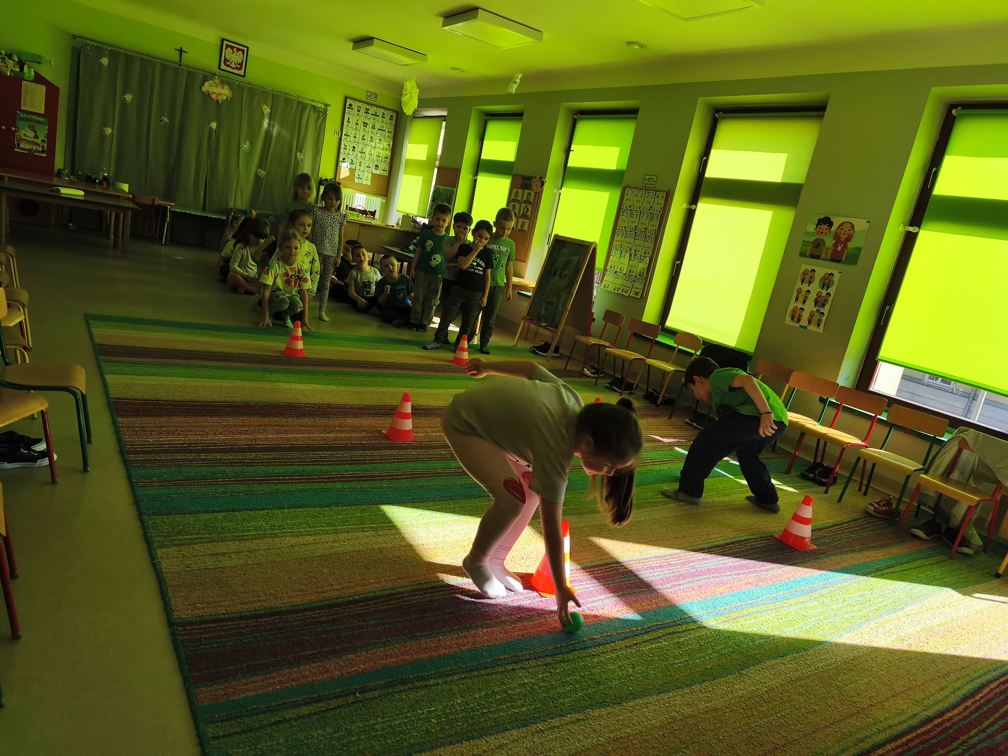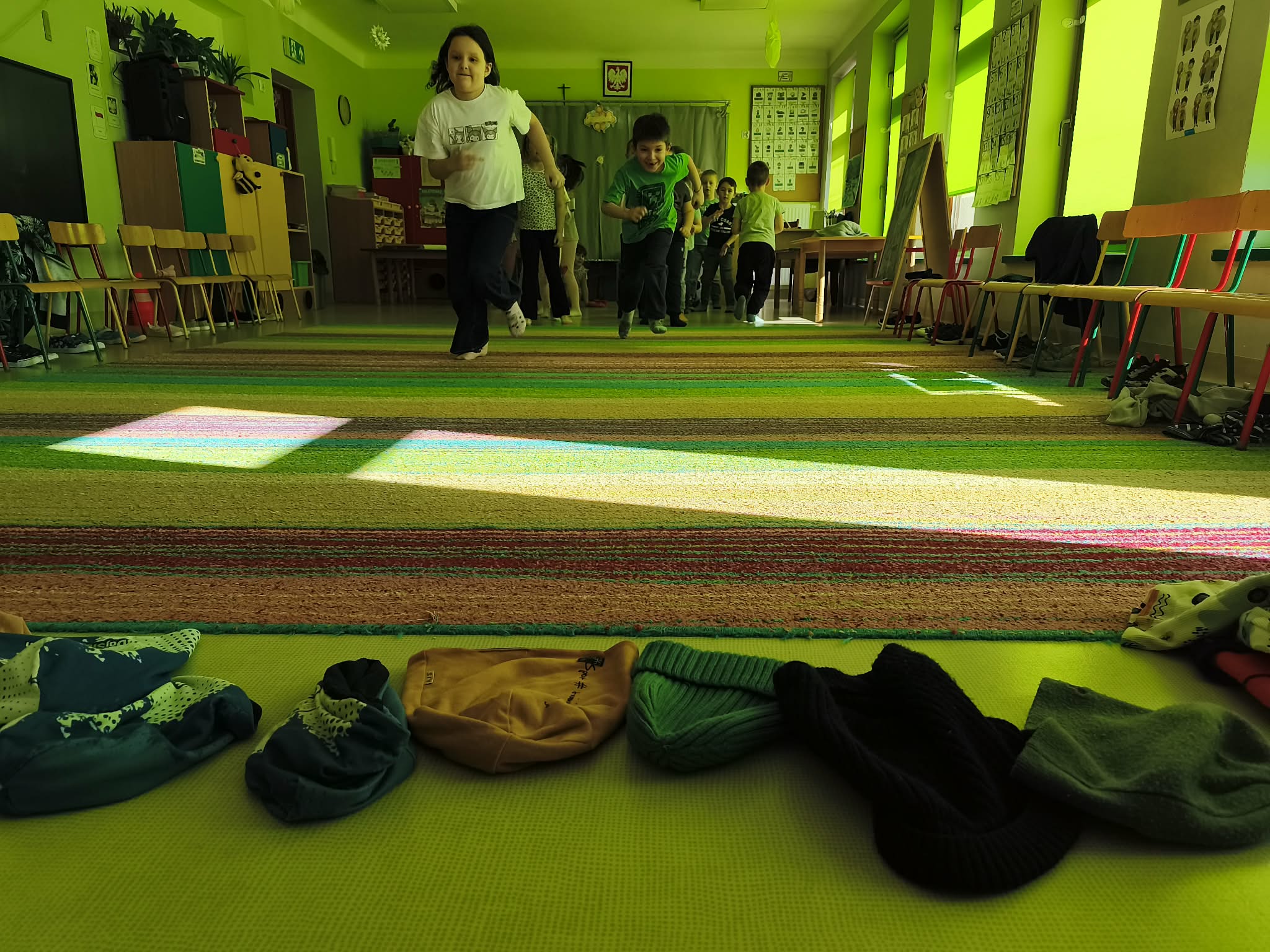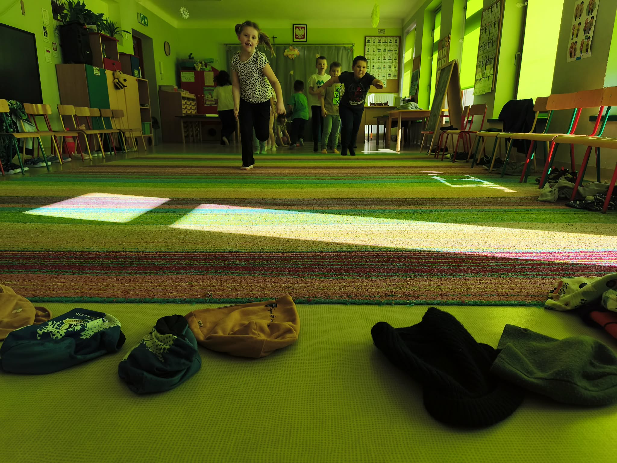 Głównym celem zajęć było zachęcenie starszaków do aktywności ruchowej, a także utrwalanie nawyku przestrzegania zasad. Dodatkowo ćwiczyliśmy również współpracę w zespołach i umiejętność słuchania poleceń złożonych, a to wszystko w ramach zabawy. Zanim przystąpiliśmy do zawodów, dzieci przygotowały salę, przyniosły czapki, szaliki, zdjęły bluzy i buciki przedszkolne, a także napiły się wody. Po podzieleniu grupy na dwa zespoły, przedszkolaki wzięły udział w czterech konkurencjach sportowych: "Bierz czapkę", "Szalikowe skoki", "Toczy się śnieżna kula" oraz "Spacer ze śnieżynką", zwracając uwagę na tempo i dokładność wykonania zadania. Podczas ich wykonywania rozwijaliśmy takie umiejętności, jak: szybkość, skoczność, uważność i koncentrację uwagi. Na koniec podsumowaliśmy punkty i obie drużyny zremisowały 3:3, za co wszyscy otrzymali pamiątkowe stempelki. Zaproponowane aktywności sprawiły dzieciom dużo radości, ale też były uwielbianą przez nich formą aktywności ruchowej i rywalizacji w duchu fair-play. "Bo liczy się sport i dobra zabawa!". Po zajęciach, przedszkolaki posprzątały przybory i przygotowały salę do podwieczorku oraz napiły się wody, a chętne osoby usiadły do stolika, by tam za pomocą kulek z papieru oraz białej farby namalować wspólną pracę pt. "Zima nocą".