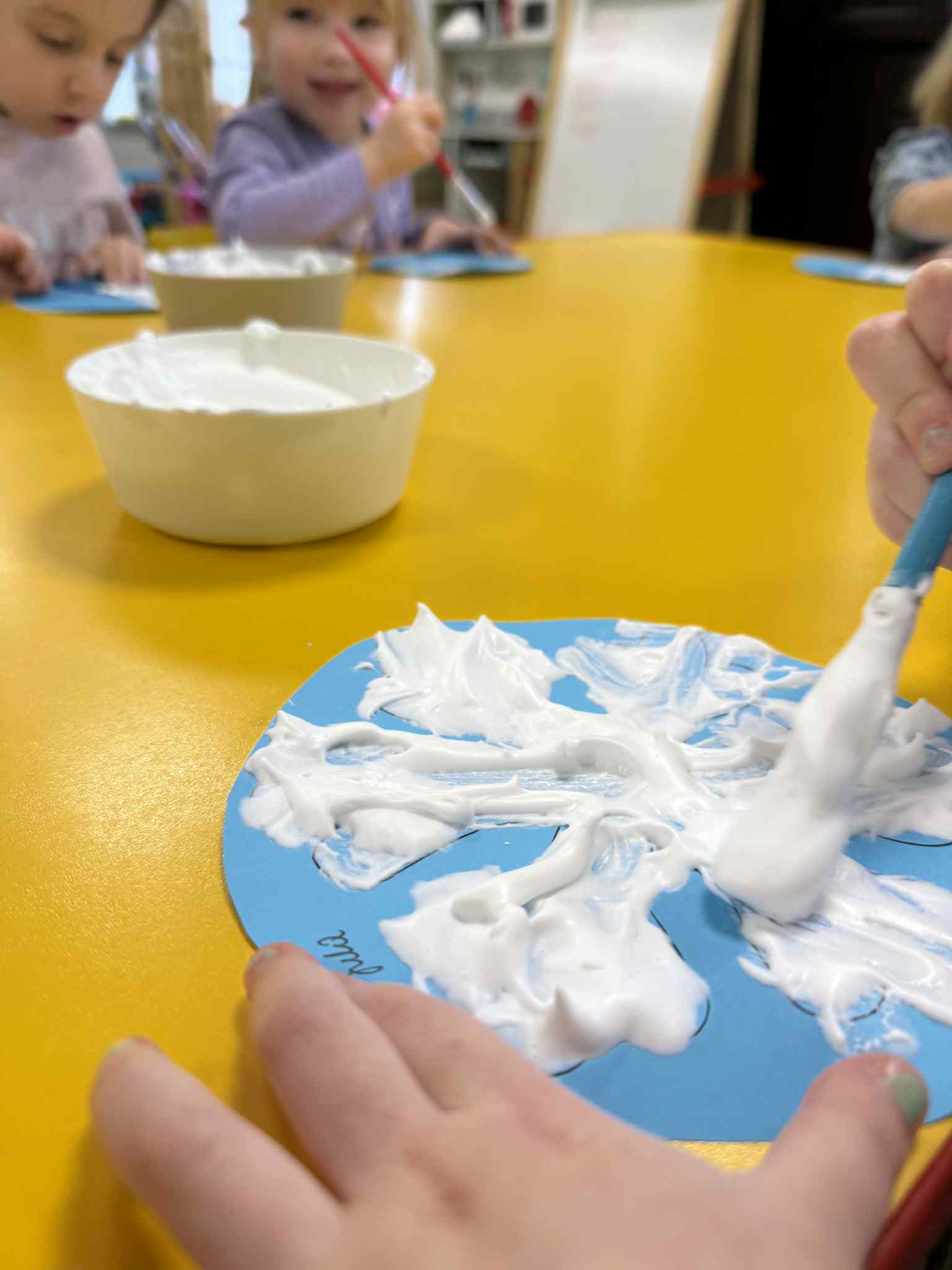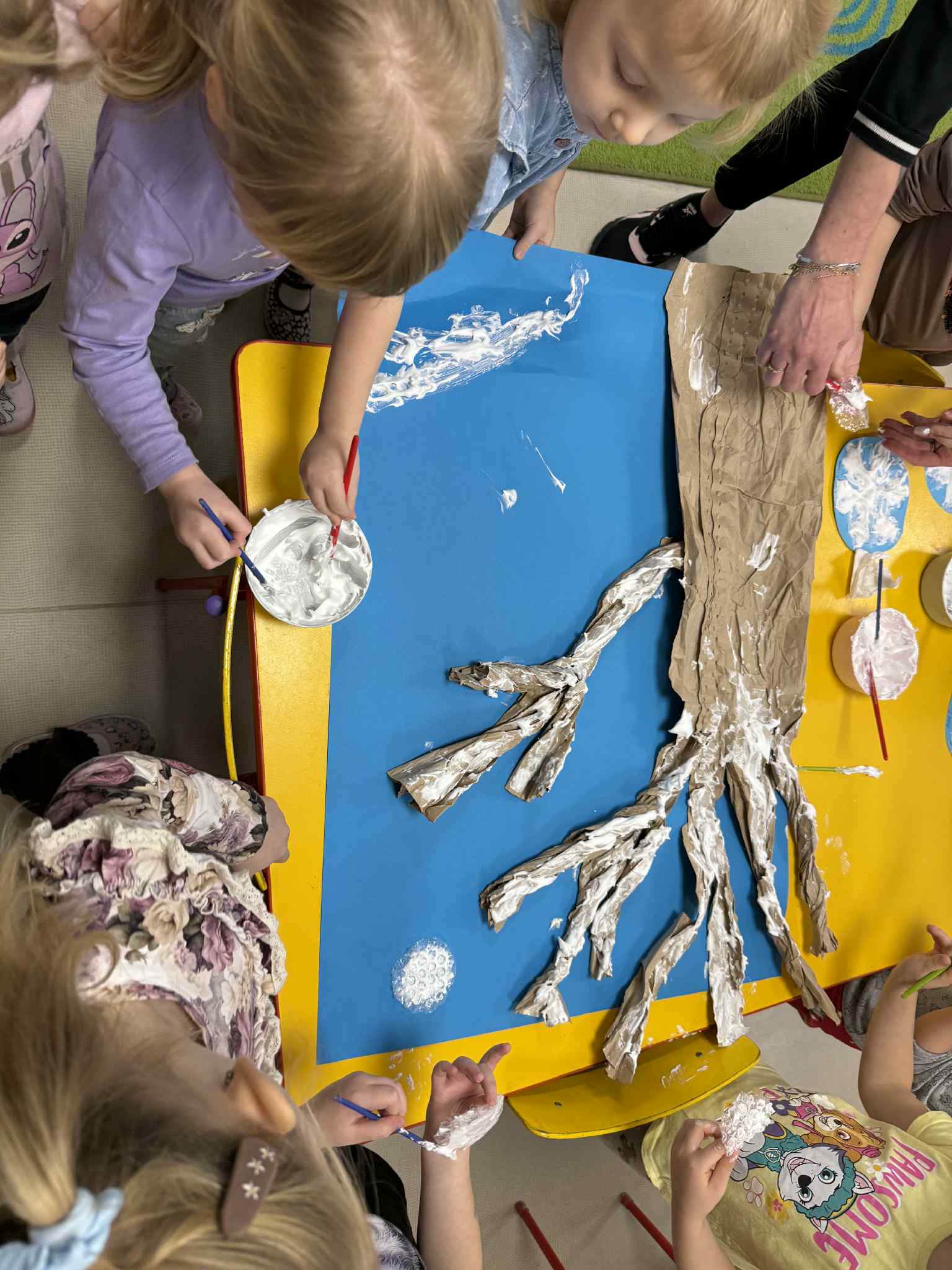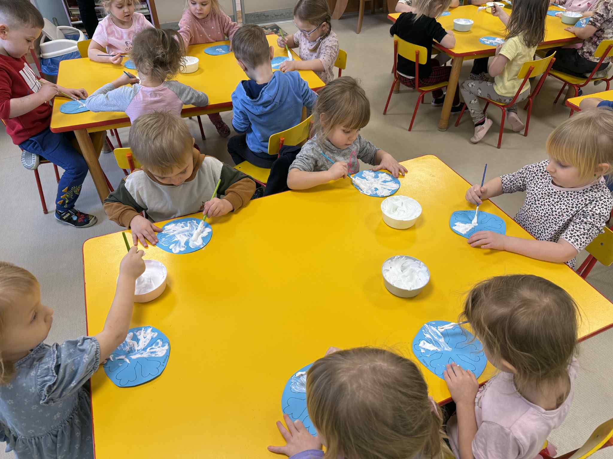 Podczas zajęć dzieci samodzielnie przygotowały puszystą, śniegową farbę. Z dużym zaangażowaniem i radością mieszały składniki, obserwując zmiany konsystencji. Następnie, wykorzystując przygotowaną farbę, stworzyły prace plastyczną przedstawiającą zimowy obraz.