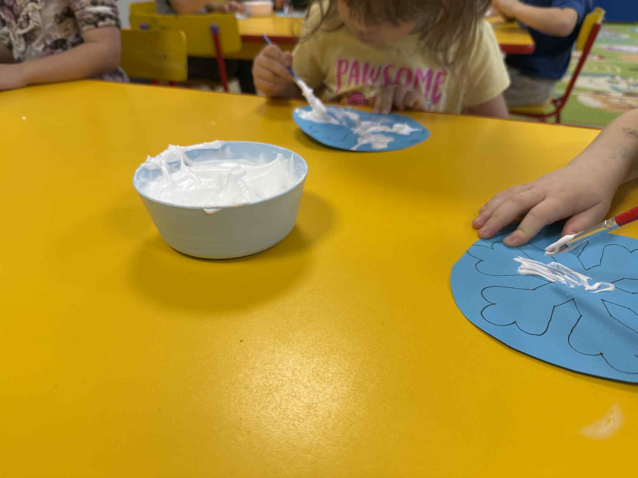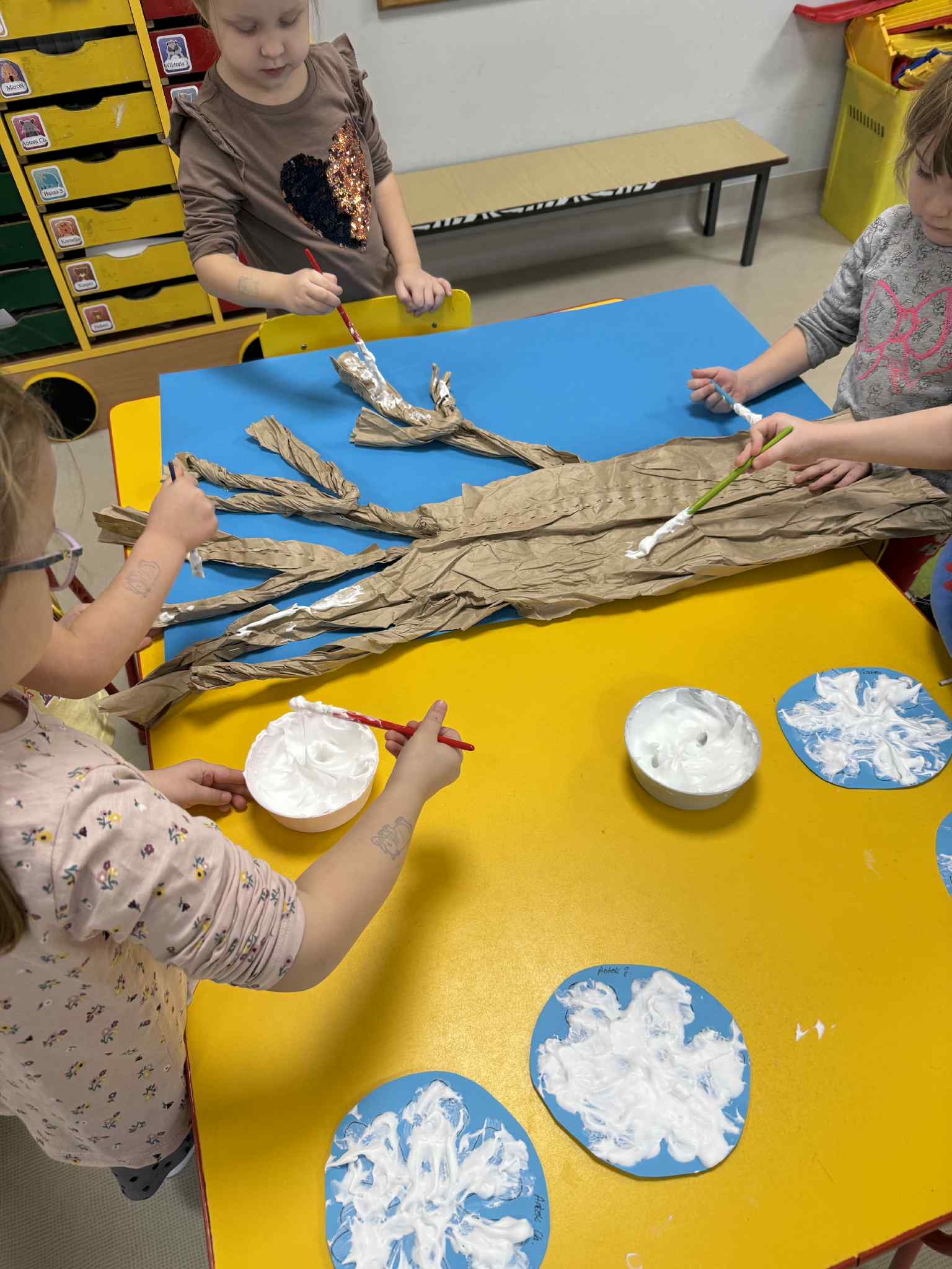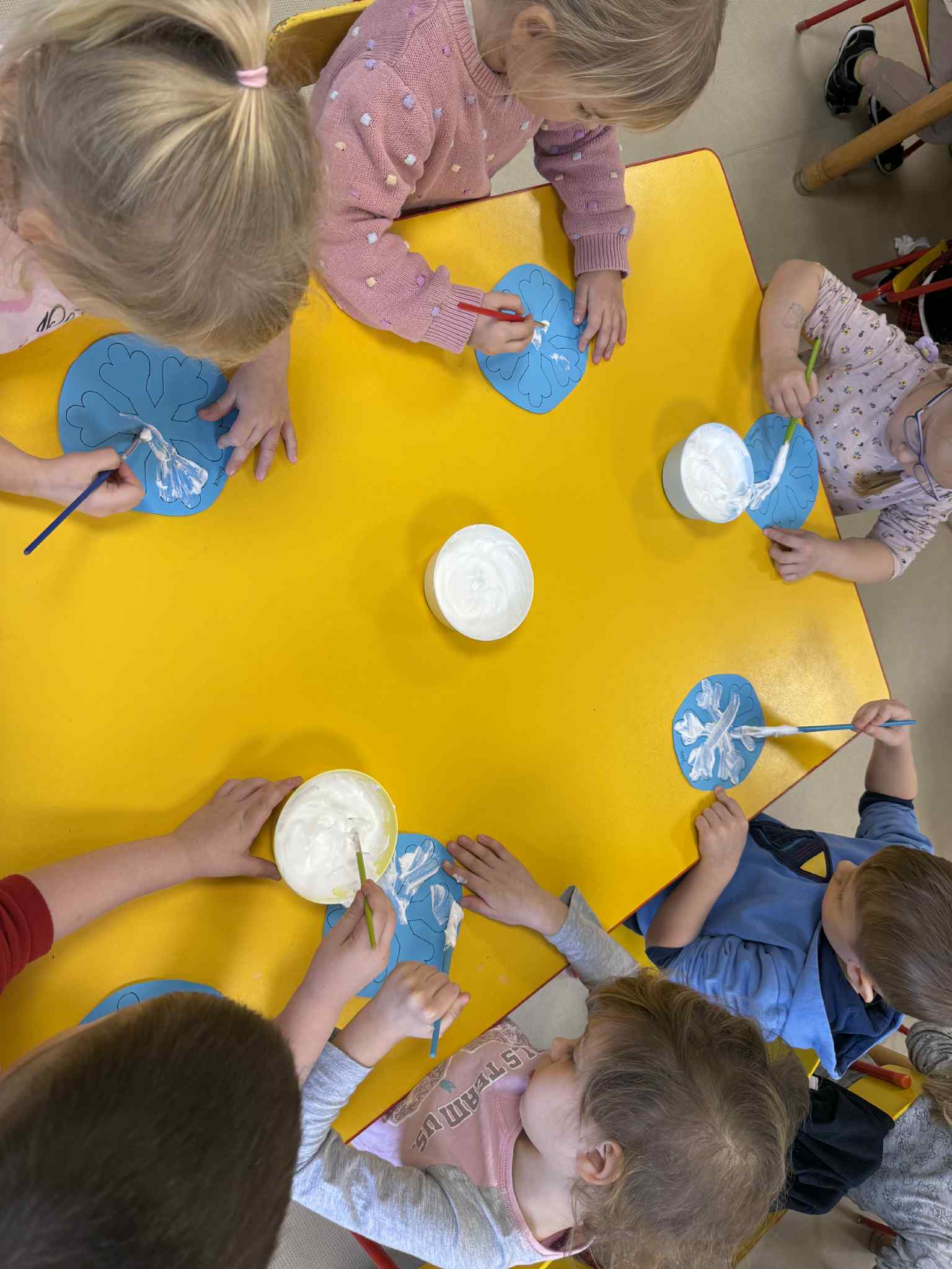 Podczas zajęć dzieci samodzielnie przygotowały puszystą, śniegową farbę. Z dużym zaangażowaniem i radością mieszały składniki, obserwując zmiany konsystencji. Następnie, wykorzystując przygotowaną farbę, stworzyły prace plastyczną przedstawiającą zimowy obraz.