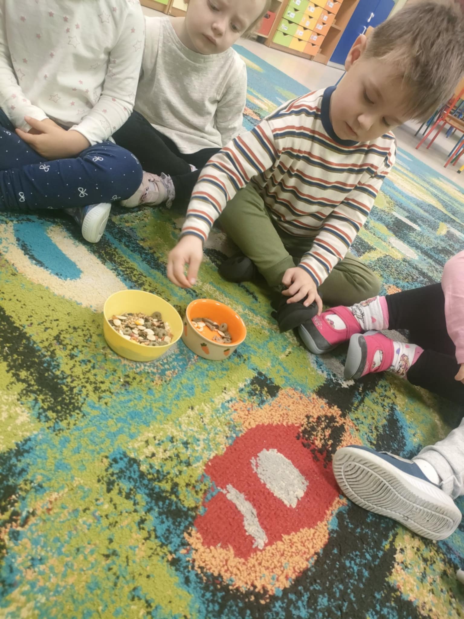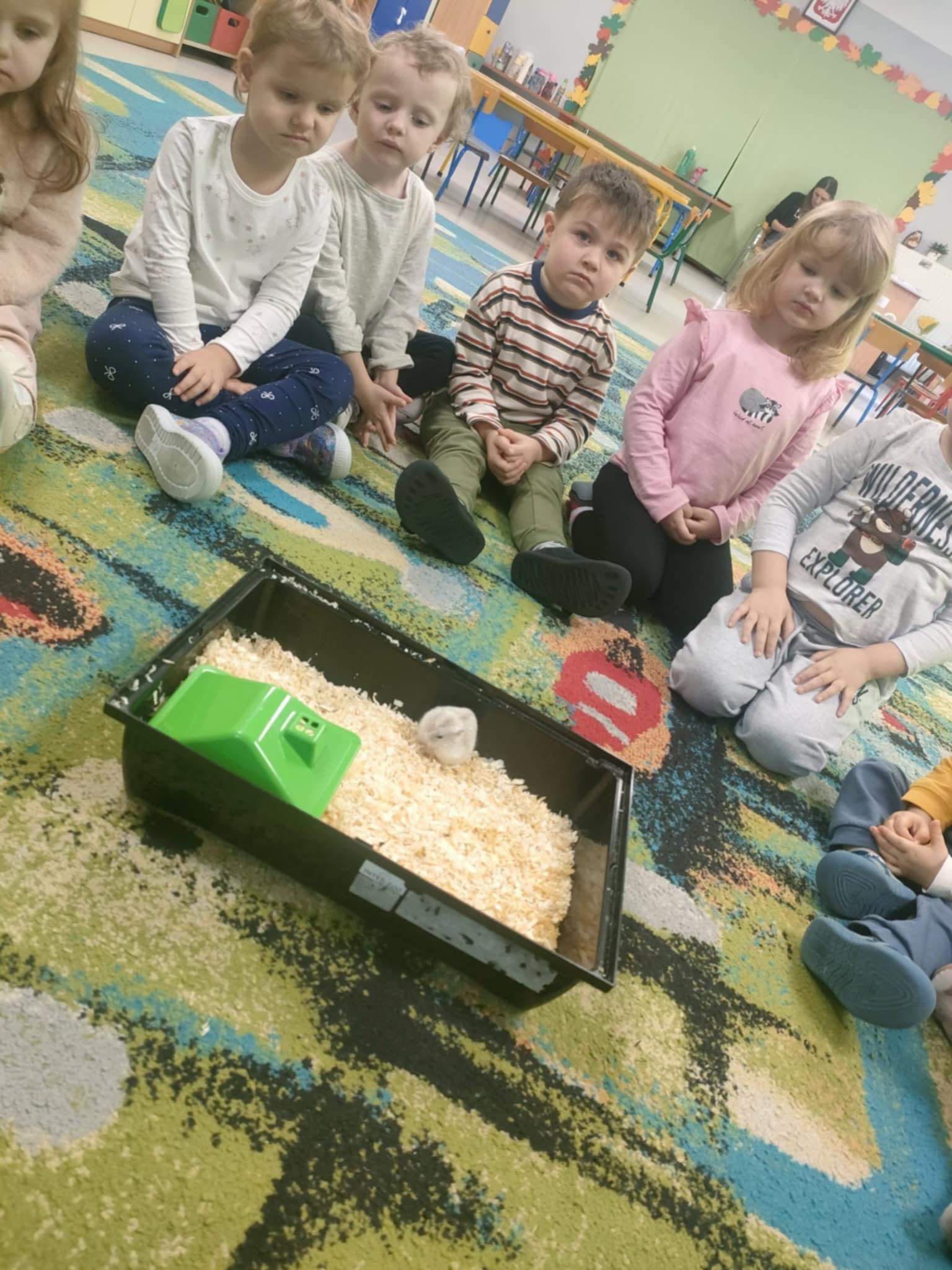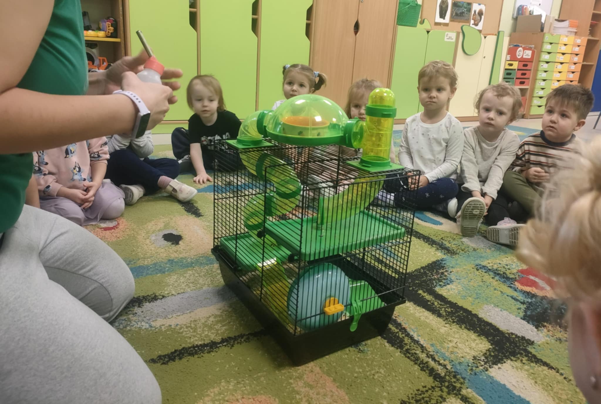 W tym tygodniu maluszki poznawały różne zwierzątka domowe, tj.: psa, kota, rybki, papugę, żółwia, królika, chomika i szynszylę. Przedszkolaki oglądały ilustracje, naśladowały ruchem i dźwiękiem wybrane zwierzaki, a także wykonały kilka prac plastycznych, związanych z tematem tygodnia. Oprócz tego, dużo rozmawialiśmy o tym, że zwierzę to nie zabawka, a jego właściciel powinien wykazywać się empatią oraz odpowiedzialnością. W piątek, w ramach podsumowania tej wiedzy, "Jeżyki" odwiedził chomik, należący do p. Justyny Skonieczka. Dzieci wymieniły mu wodę w poidełku, karmę w miseczce i ogladały klatkę wraz z jej elementami. Przy okazji dowiedziały się, że są małe(zazwyczaj mieszczą się w rączce), szybkie i zwinne, żyją przeciętnie ok. 2 lat i przeważnie śpią w dzień, a do prawidłowego funkcjonowania potrzebują ruchu. Warto podkreślić, że dzieci podczas kontaktu z chomikiem, zachowały się wzorowo, pamiętając o ciszy podczas zajęć.