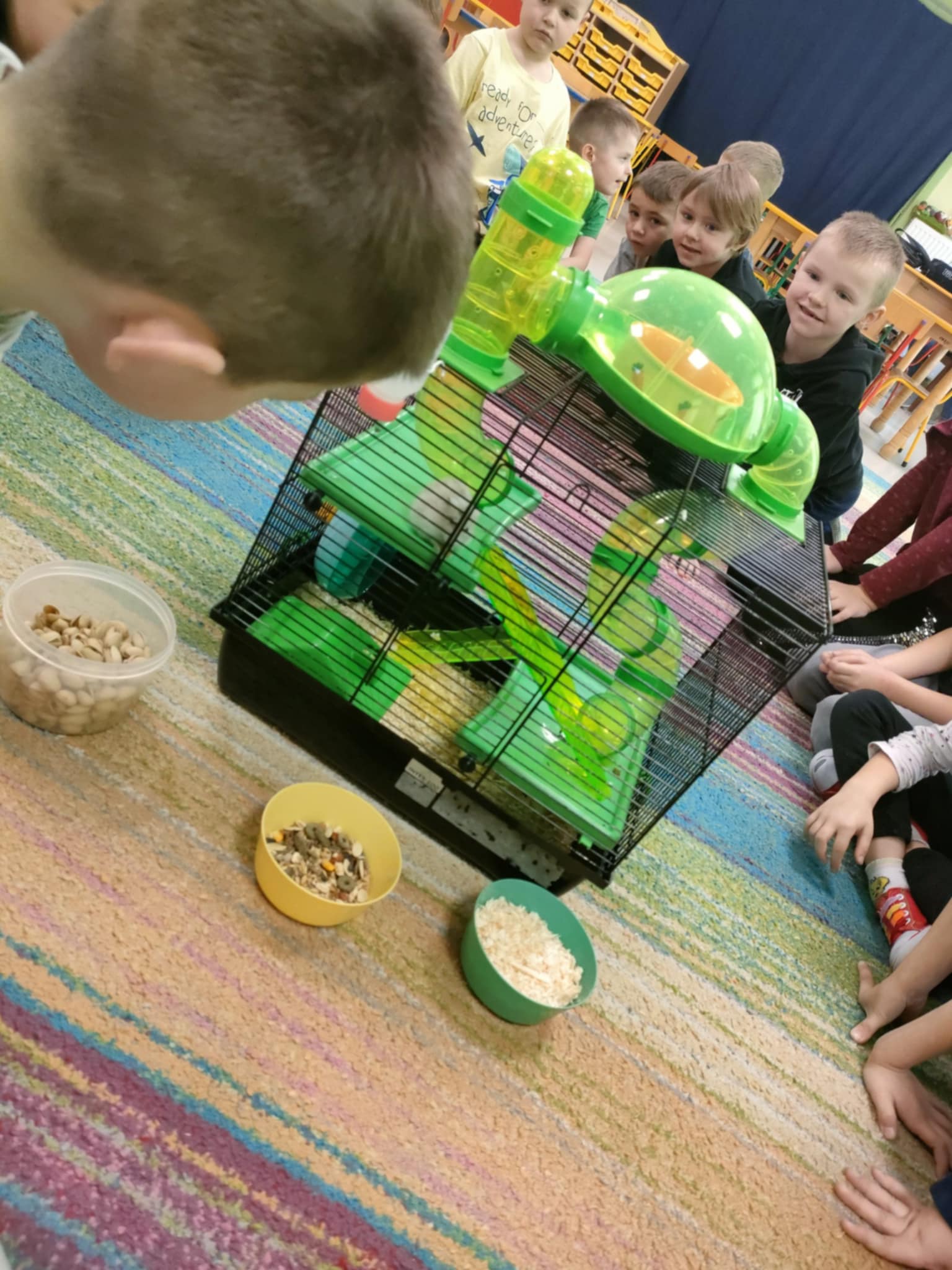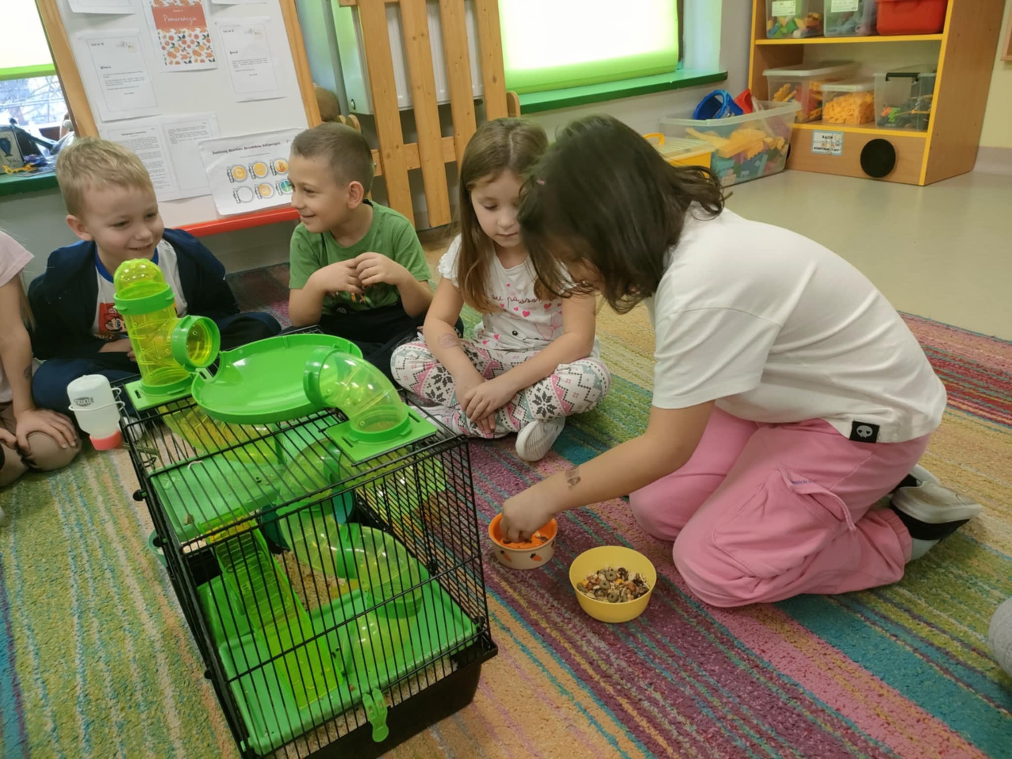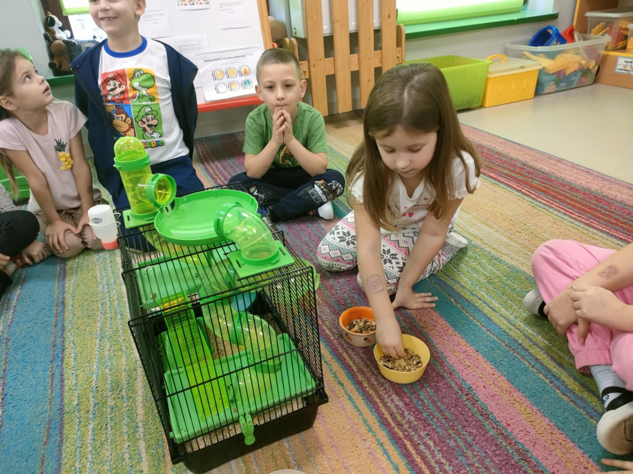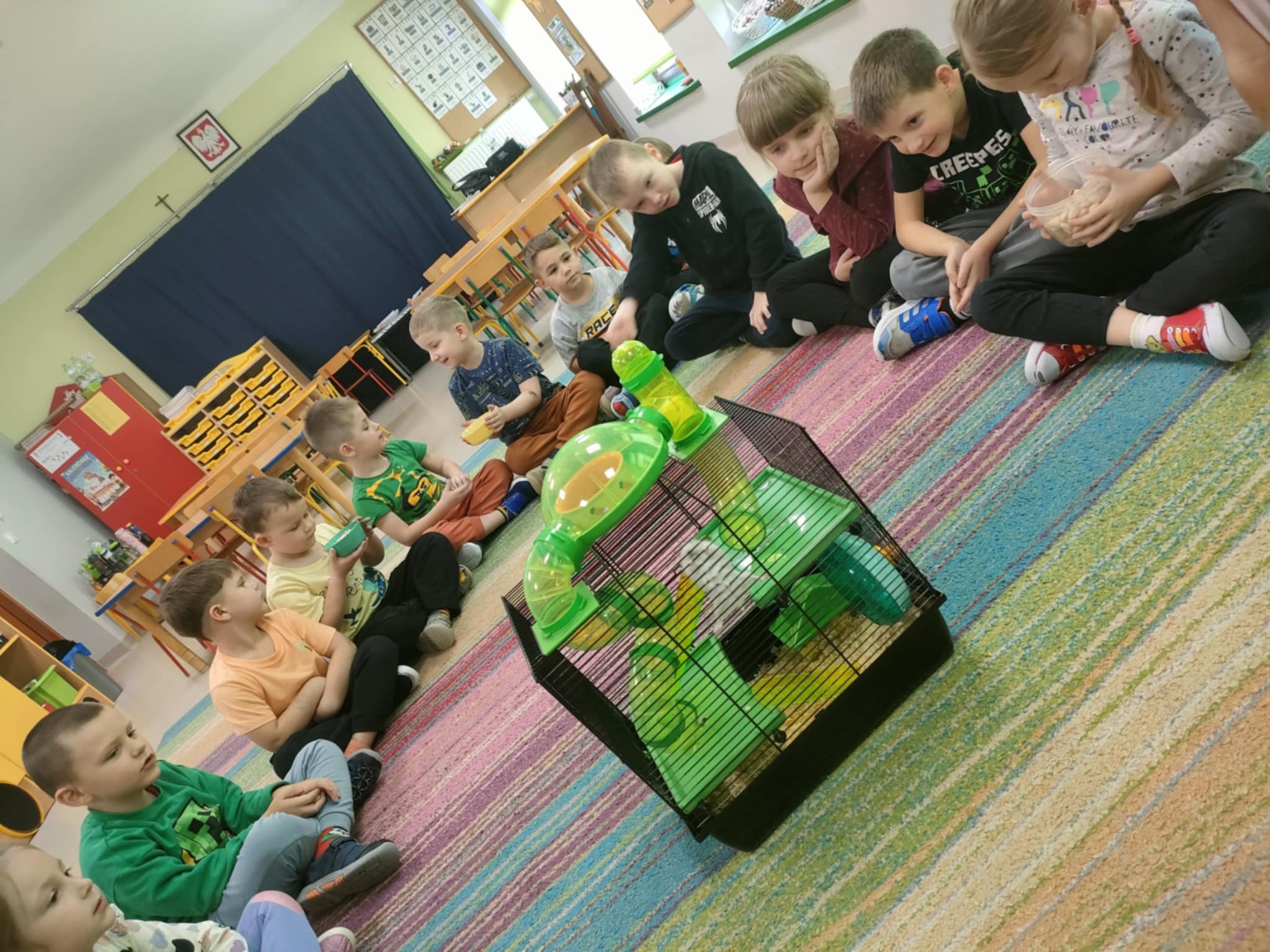 W tym tygodniu "Pszczółki" omawiały różne zwierzęta domowe. Oprócz tego, dużo rozmawialiśmy o tym, że zwierzę to nie zabawka, a jego właściciel powinien wykazywać się empatią oraz odpowiedzialnością. W piątek, w ramach podsumowania tej wiedzy, "Pszczółki" odwiedził chomik, należący do p. Justyny Skonieczka. Dzieci wymieniły mu wodę w poidełku, karmę w miseczce i ogladały klatkę wraz z jej elementami(domek, kołowrotek, tunele, balkon, trociny). Przy okazji przypomniały sobie, że są małe(zazwyczaj mieszczą się w rączce), szybkie i zwinne, żyją przeciętnie ok. 2 lat i przeważnie śpią w dzień, a do prawidłowego funkcjonowania potrzebują ruchu. Zazwyczaj są samotnikami i preferują życie w pojedynkę, a podstawą ich diety są nasiona i zboża, wzbogacone o suszone owoce i warzywa. Warto podkreślić, że dzieci podczas kontaktu z chomikiem, zachowały się wzorowo, pamiętając o ciszy podczas zajęć.